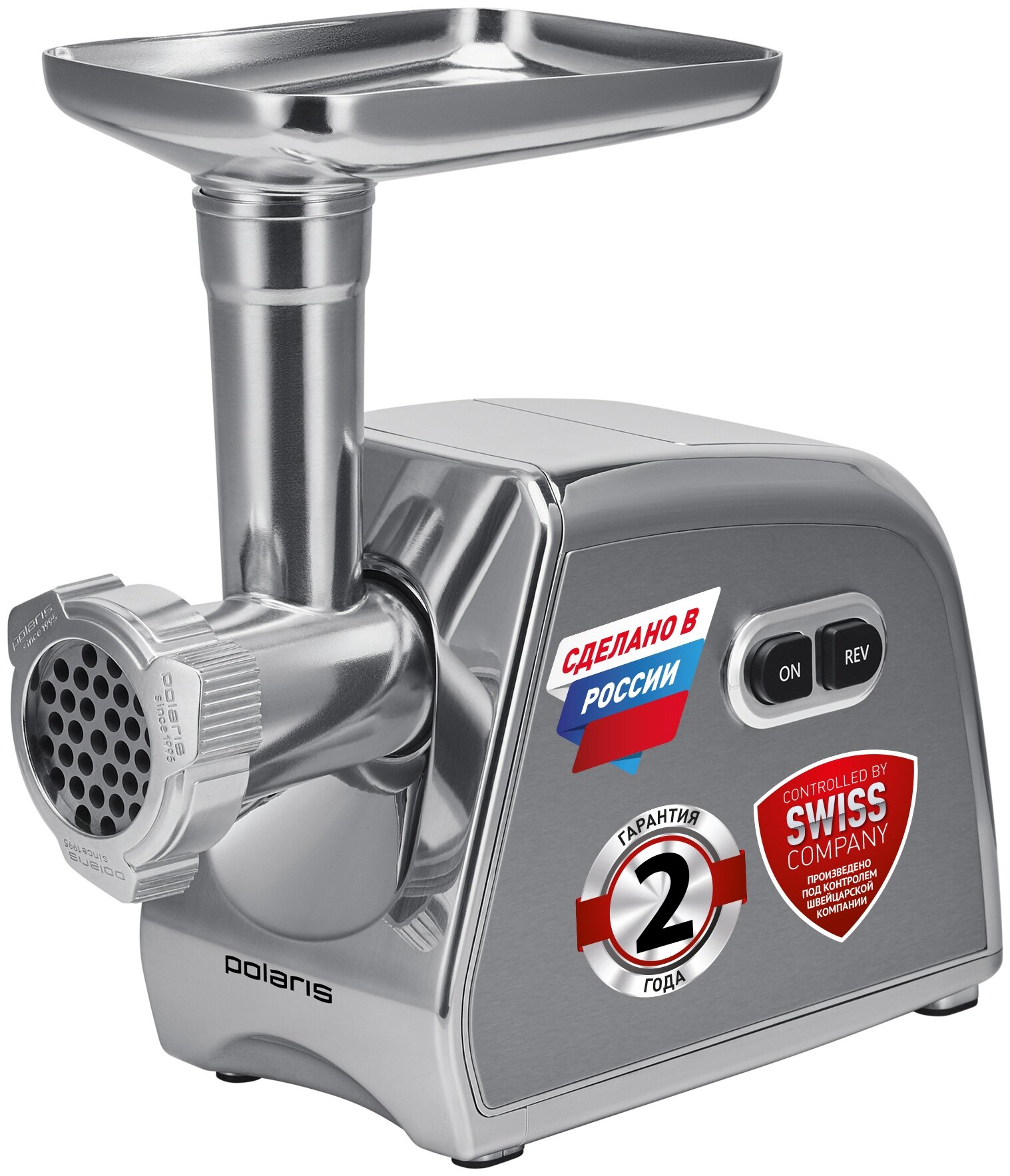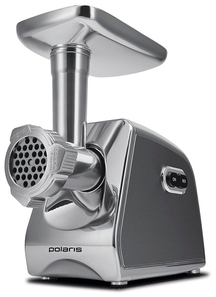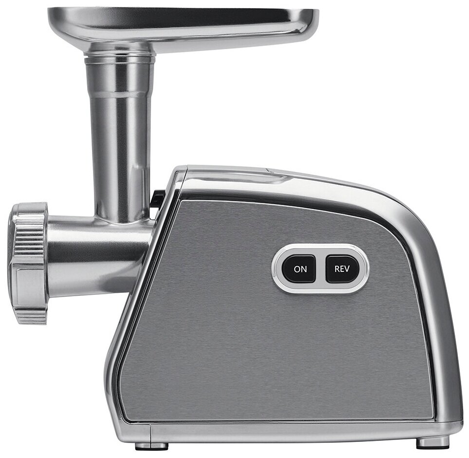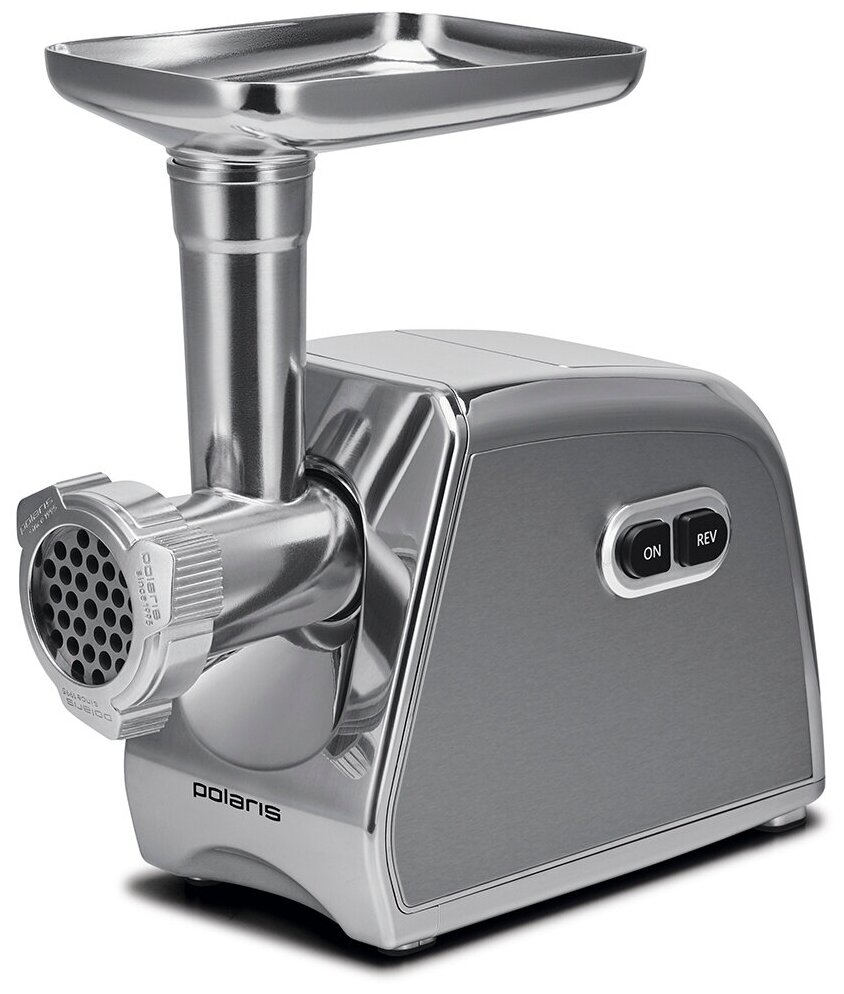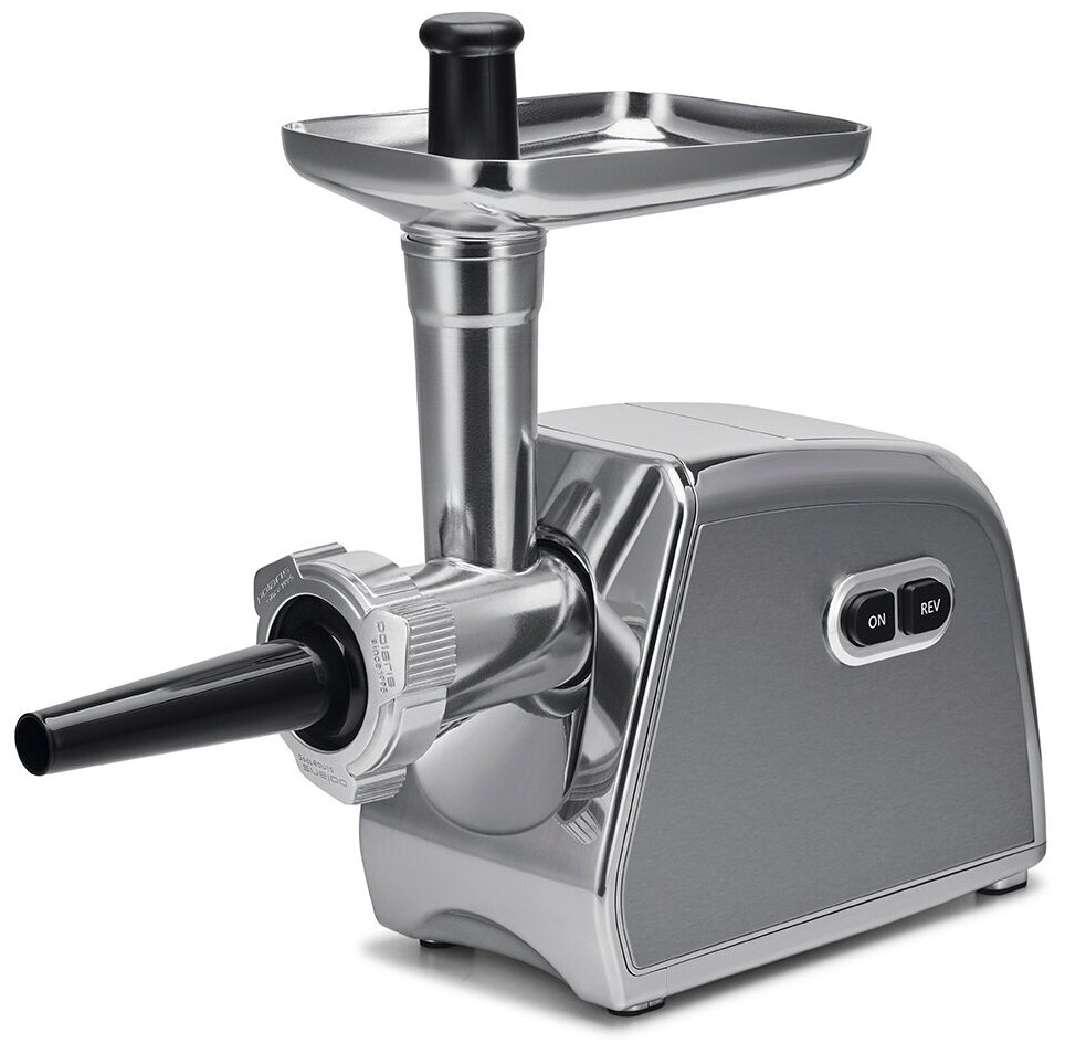 мощность 550 Вт (макс. - 3000 Вт), производительность 3 кг/мин, защита двигателя от перегрузки, система реверса, насадка-терка, насадка для приготовления колбас, насадка для шинковки, насадка для кеббе, диск для фарша