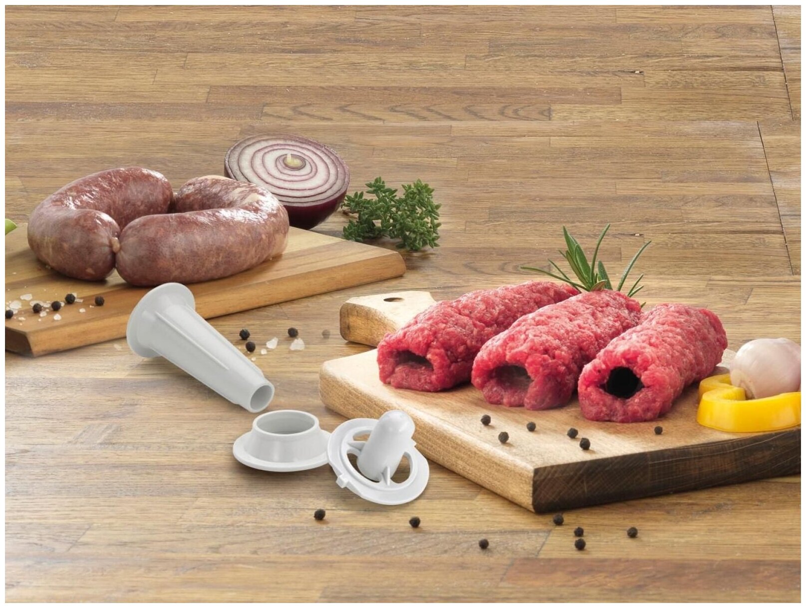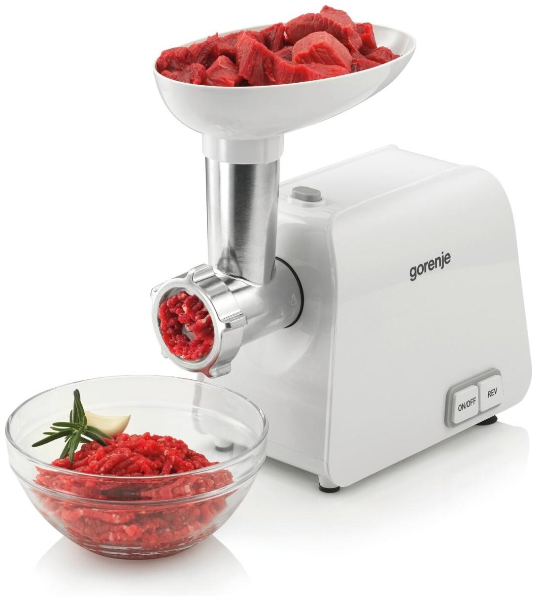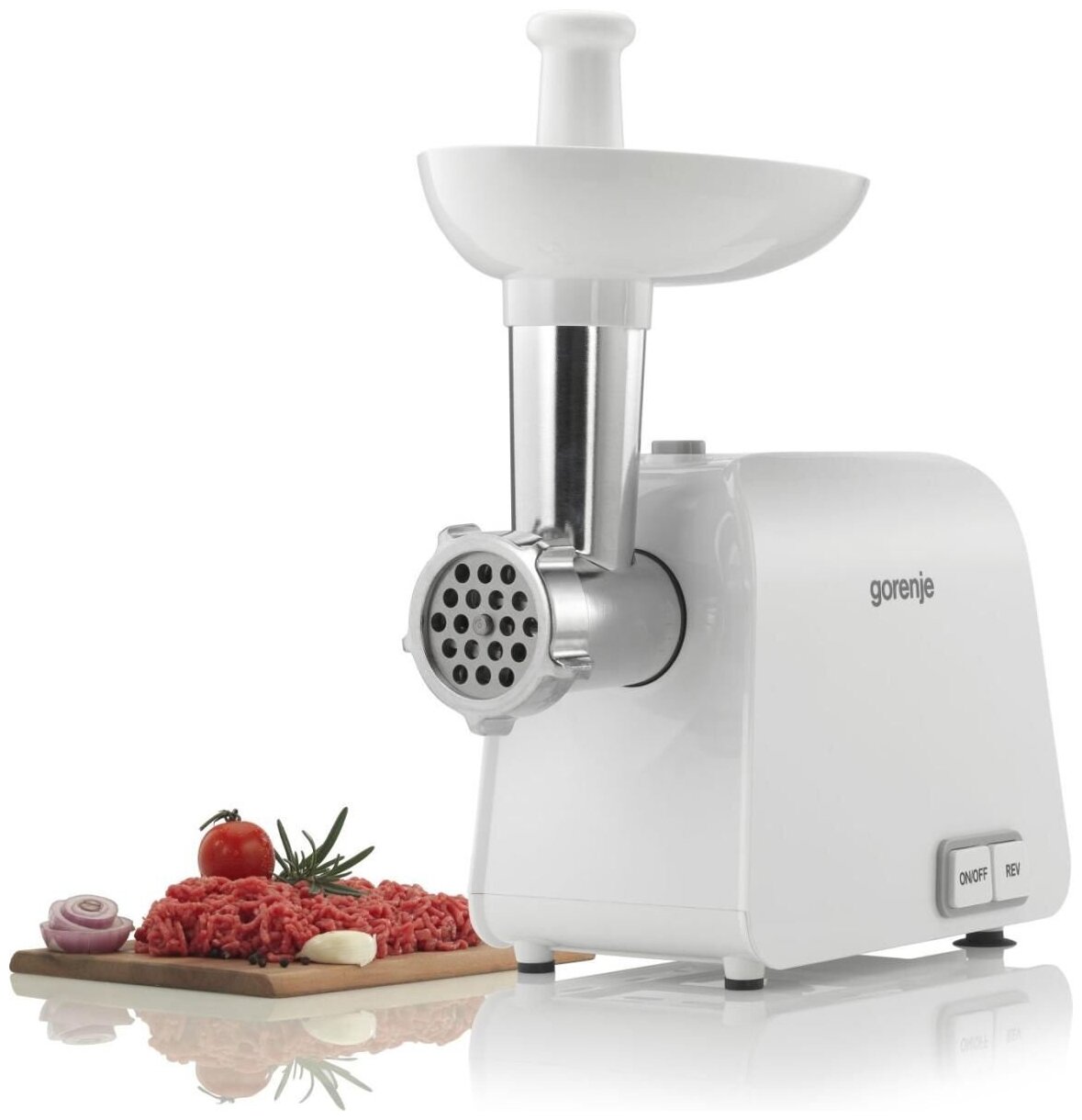 насадки: диск для фарша, насадка для кеббе, насадка для приготовления колбас, материал корпуса: пластик, система реверса, производительность: 1.90 кг/мин, особенности: защита от перегрузки, прорезиненные ножки, количество перфорированных дисков: 2