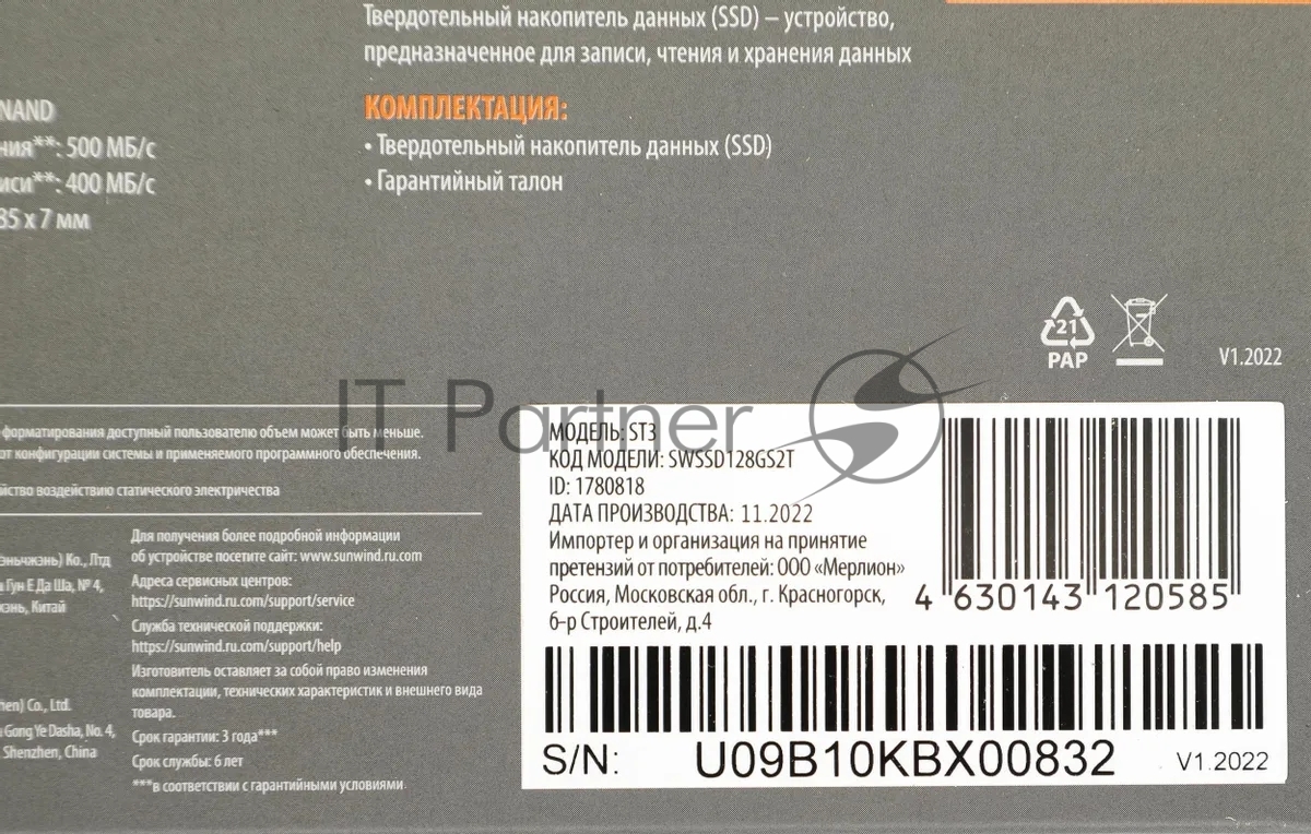 Накопитель SSD SunWind ST3 SWSSD128GS2T, 128Gb, SATA III, 2.5", R/W 500/400