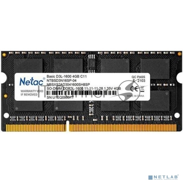 Оперативная память NETAC Basic, DDR3L, 4GB (1x4GB), 1600MHz, CL11, SO-DIMM