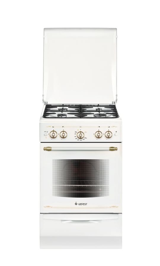 эмалированная рабочая поверхность; 4 конфорки; газовая духовка, объем 52 л; ШхВхГ: 50х85х58.50 см; гриль газовый; механическое управление; газ-контроль духовки, электроподжиг