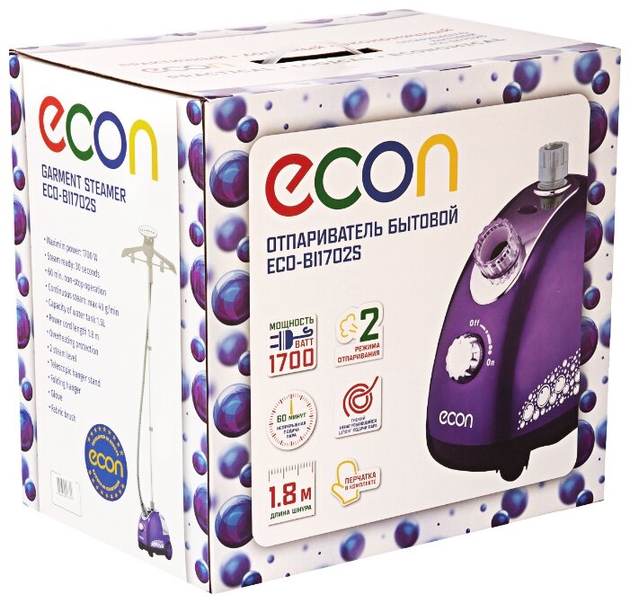 конструкция: напольный; мощность: 1700 Вт; максимальная подача пара: 40 г/мин; время работы: 60 мин; телескопическая стойка; автоматическое отключение