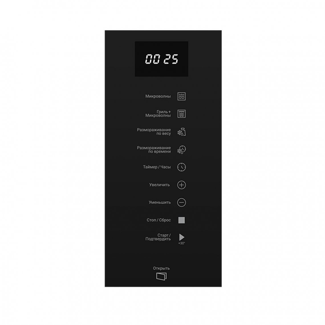 Общие: Гриль: Есть: Тип управления: Электронный: Открывание дверцы: Электронное: Направление открытия дверцы: Налево: Камера: Объем: 25 л: Диаметр поворотного стола: 24.5 см: Подсветка: Есть: Функции: Автоматическое приготовление: Есть: Количество программ автоматического приготовления: 8: Автоматическое размораживание: Есть: Количество программ автоматического размораживания: 2: Звуковой сигнал окончания работы: Есть: Кнопка "30 сек": Есть: Кнопка "Меньше/Больше": Есть: Таймер: Есть: Дисплей: Часы: Есть: Отображение времени до конца: Есть: Отображение режимов работы: Есть: Цвет светящихся символов: Белый: Мощность: Мощность микроволн: 900 Вт: Количество уровней мощности: 5: Мощность гриля: 1000 Вт: Мощность потребляемая: 1450 Вт: Безопасность: Защита от детей: Есть: Комплектация: Решетка для гриля: Есть: Габариты и вес: Высота: 38 см: Ширина: 59.4 см: Глубина: 40.3 см: Высота ниши: 38 см: Ширина ниши: 56-60 см: Глубина ниши: 55 см: Вес: 17.83 кг: Цвет: Черный;