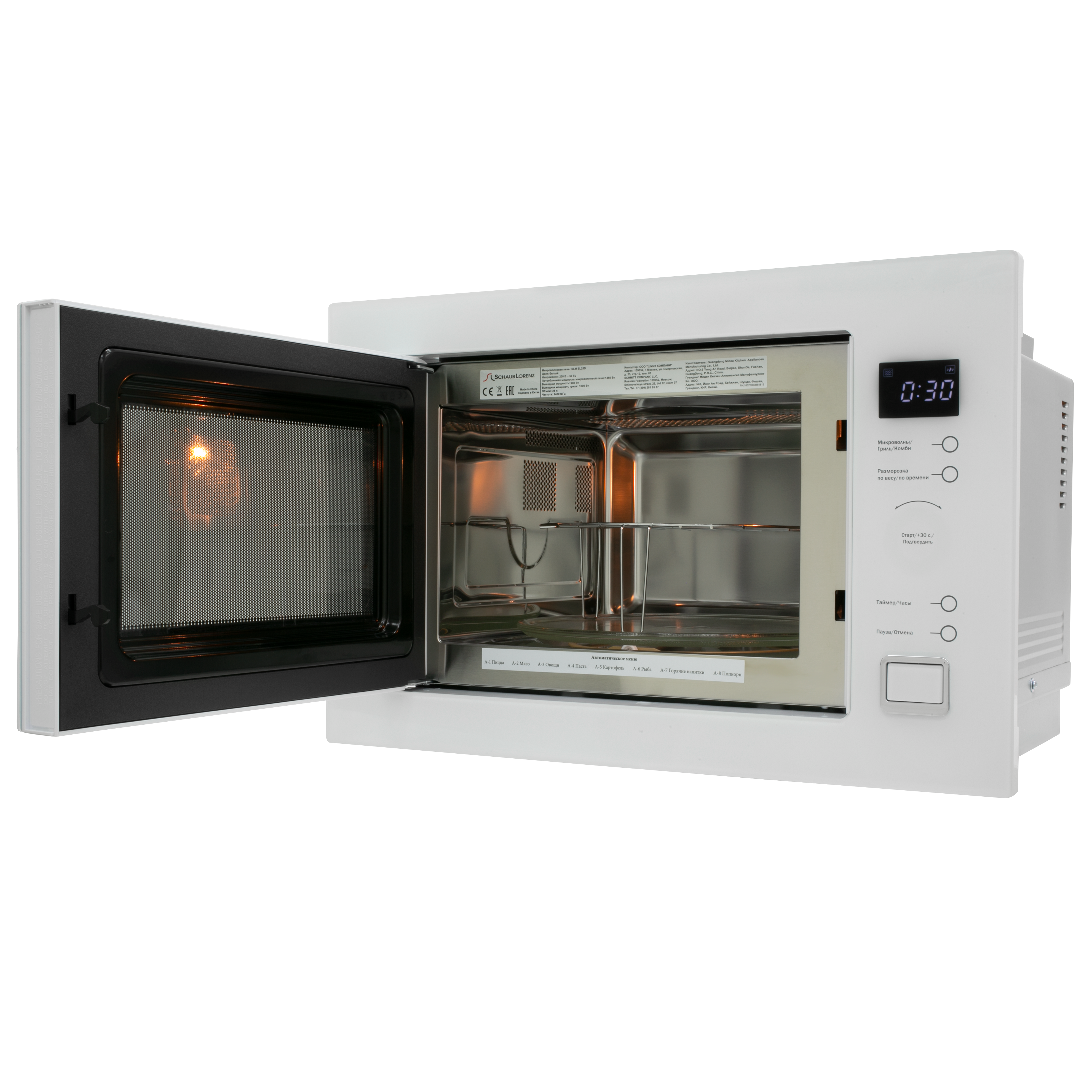 Общие характеристики: Цвет: белый: Объем: 25 л: Расположение: встраиваемая: Диаметр поддона: 315 мм: Внутреннее покрытие камеры: нерж. сталь: Переключатели: кнопочные: Режимы работы: Режимы работы: гриль, микроволны + гриль, нижний гриль, разморозка: Дополнительные режимы: автоматическая разморозка, автоматический разогрев, автоматическое поддержание температуры, автоматическое приготовление, звуковой сигнал отключения, экспресс-режим приготовления: Дополнительные характеристики: Особенности: блокировка от детей, дисплей, кнопка +30 секунд, подсветка камеры, система равномерного распределения микроволн: Мощность микроволн: 900 Вт: Тип гриля: тэновый: Мощность гриля: 1000 Вт: В комплекте: блюдо для хрустящей корочки: Дверца: навесная: Открывание дверцы: кнопка: Дополнительная информация: стеклянный поднос; роликовая подставка; инструкция; гарантийный талон: Ширина: 59.5 см: Высота: 38.8 см: Глубина: 40 см: Вес: 19.5 кг;;