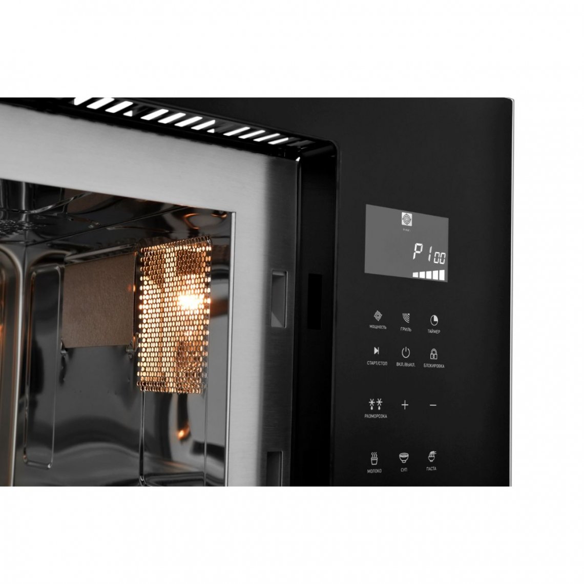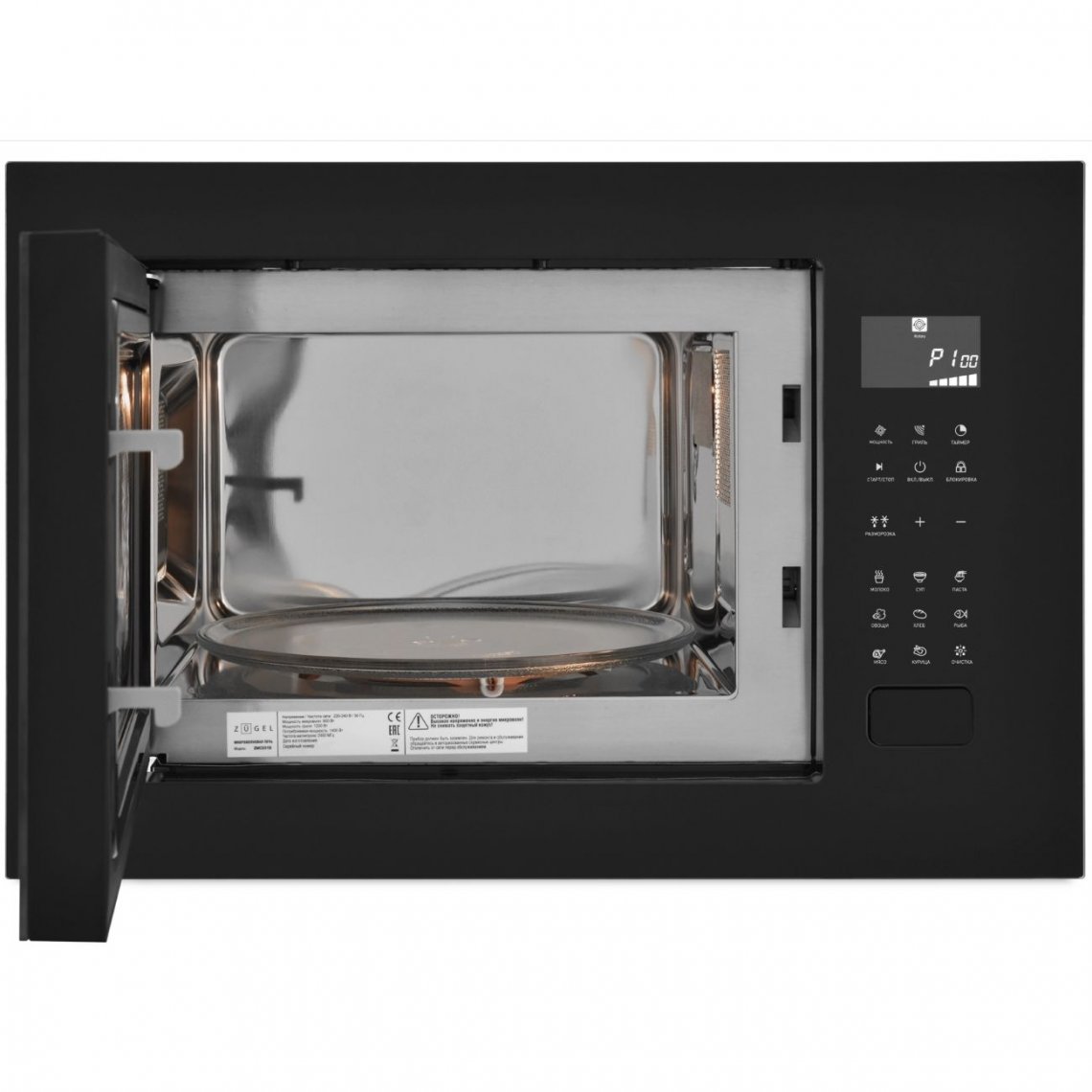 Общие: Гриль: Есть: Тип управления: Сенсорный: Открывание дверцы: Кнопка: Направление открытия дверцы: Налево: Камера: Объем: 25 л: Диаметр поворотного стола: 24.5 см: Тип внутреннего покрытия: Нержавеющая сталь: Подсветка: Есть: Функции: Автоматическое приготовление: Есть: Количество программ автоматического приготовления: 9: Автоматическое размораживание: Есть: Количество программ автоматического размораживания: 1: Поэтапное приготовление: Есть: Режим удаления запахов: Есть: Звуковой сигнал окончания работы: Есть: Таймер: Есть: Дисплей: Часы: Есть: Отображение времени до конца: Есть: Отображение режимов работы: Есть: Цвет светящихся символов: Белый: Мощность: Мощность микроволн: 700 Вт: Мощность гриля: 1200 Вт: Мощность потребляемая: 1400 Вт: Безопасность: Защита от детей: Есть: Габариты и вес: Высота: 40 см: Ширина: 59.5 см: Глубина: 39 см: Высота ниши: 38 см: Ширина ниши: 58 см: Глубина ниши: 45 см: Вес: 15.5 кг: Цвет: Черный;