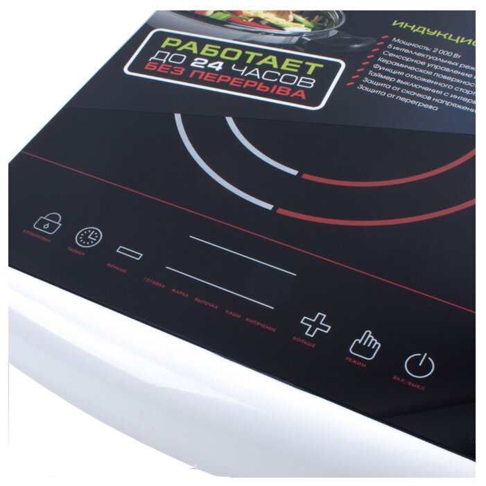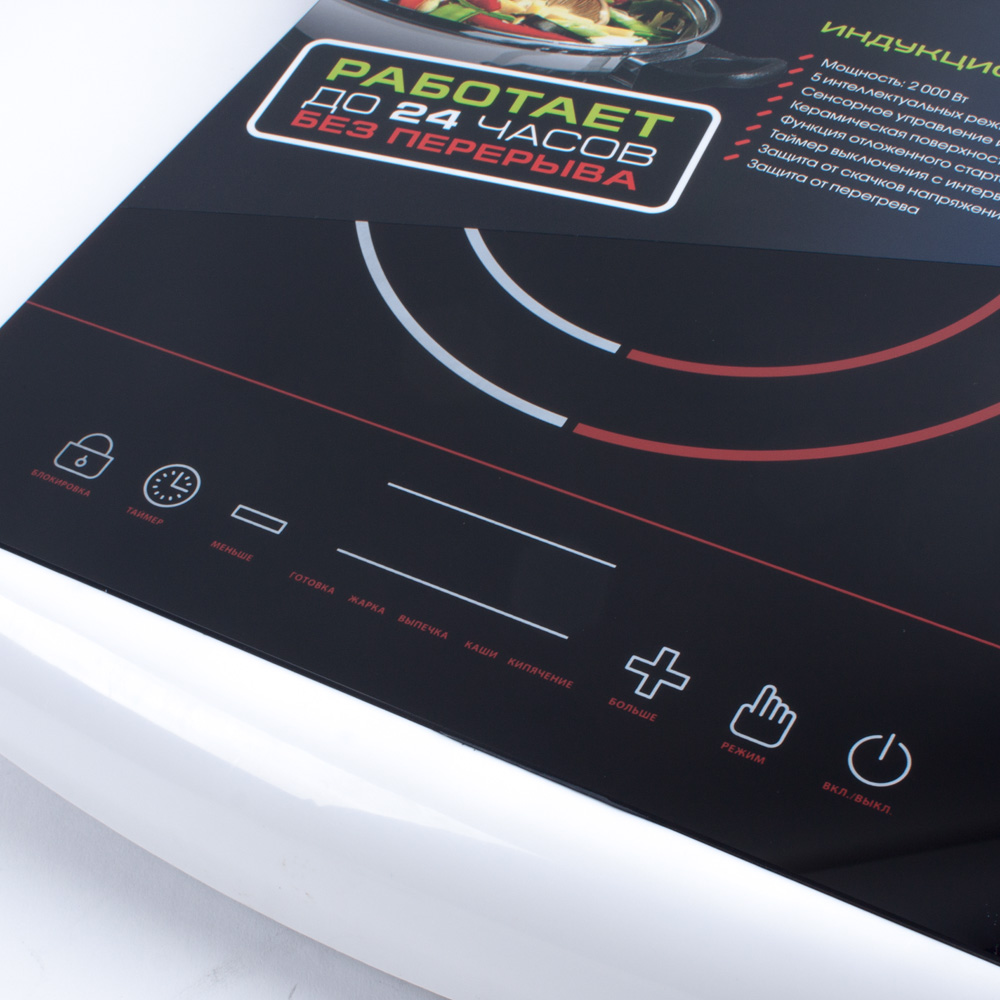 Готовлю на этой плите уже почти 2 месяца и нареканий нет. Плита на одну конфорку и с хорошей мощностью нагрева когда жарю блину нужно быть внимательной. Электронная панель для регулировки и выбора программ. Индикация при включении для визуального контроля в темное время суток. Верх стеклокерамика низ пластик. Охлаждение как кулер на ноутбуке есть некий шум но не критичный. Компактна и удобна в практике по уходу вопросов нет протереть достаточно после приготовления. Принцип работы не знаю но довольно скоростью нагрева намного шустрее чем на газу. С выбором не ошиблась. Цена того стоит для приобретения.