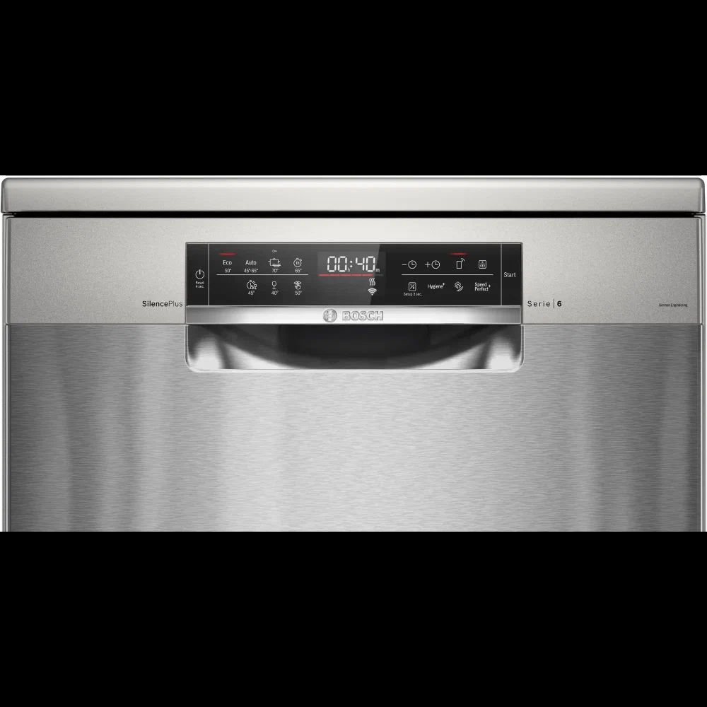 Общие характеристики: Цвет: серебристый: Линейка: Serie 6: Вместимость: 13 комплектов: Тип: полноразмерная: Тип установки: отдельно стоящая: Класс энергопотребления: A++: Класс мойки: A: Класс сушки: A: Управление: электронное: Инверторный двигатель: да: Высота: 84.5 см: Ширина: 60 см: Глубина: 60 см: Расход воды: 9.5 л: Максимальная потребляемая мощность: 2400 Вт: Уровень шума при работе: 42 дБ: Программы и режимы мойки: Программы: автоматическая, быстрая, ночная, режим половинной загрузки, экономичная: Количество программ мойки: 4: Количество температурных режимов: 4: Тип сушки: турбосушка: Особенности: Особенности конструкции: дисплей, таймер отсрочки, Поддон для столовых приборов, Полка для чашек, Регулировка высоты корзин, Самоочищающийся фильтр: Индикаторы наличия средств: наличия ополаскивателя, наличия соли, Неисправность, Ход программ: Безопасность: защита от детей, защита от протечек: Тип защиты от протечек: полная: В комплекте: Посудомоечная машина, документация;