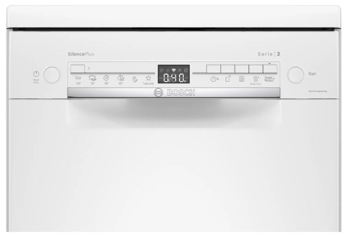 линейка: Serie 2; узкая, отдельно стоящая, ширина 45 см; вместимость: 9 комплектов; 4 программы мойки; инверторный двигатель; расход воды 8.5 л; управление со смартфона; интенсивная сушка класса A; таймер отсрочки запуска; класс энергопотребления A; защита от детей; уровень шума при работе 48 дБ; полная защита от протечек