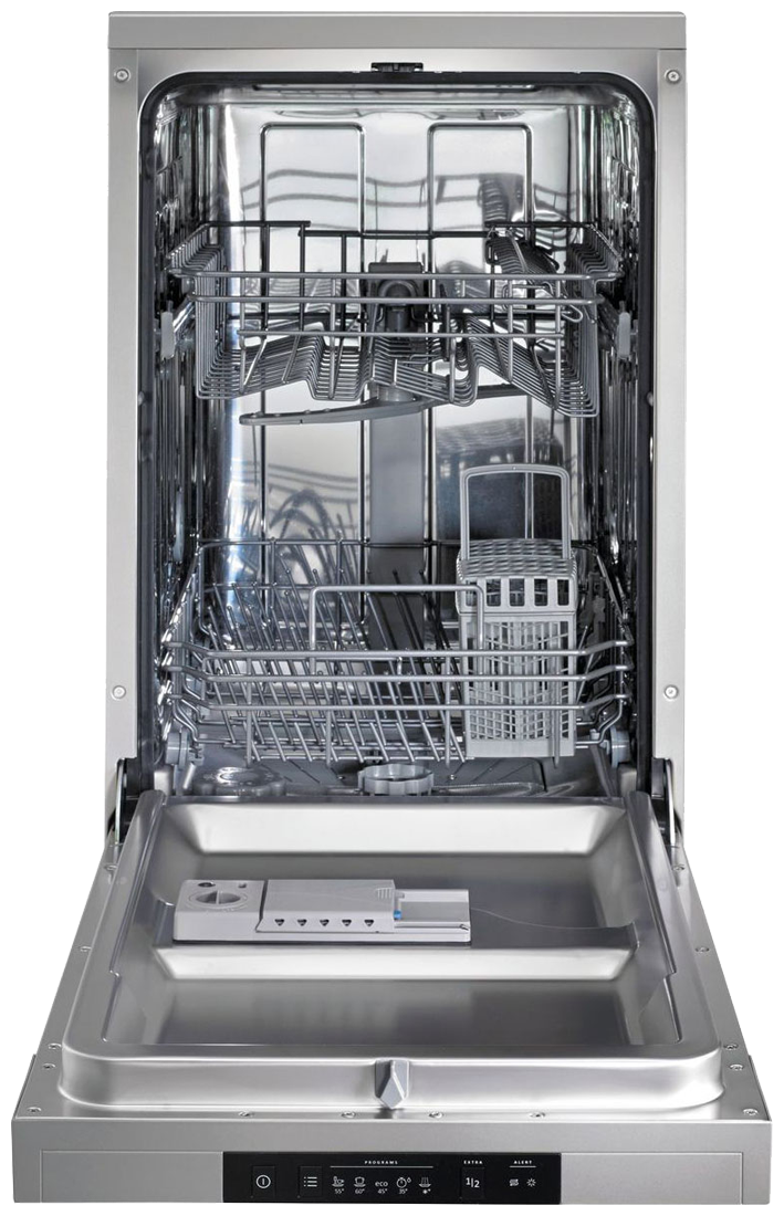тип установки: отдельно стоящая, тип: узкая, ширина: 44.80 см, высота: 84.50 см, глубина: 60 см, безопасность: защита от протечек, индикация работы: звуковая, программы: быстрая, интенсивная, предварительное ополаскивание/замачивание, экономичная, вместимость: 9 комплектов, управление: электронное, особенности: внутренняя поверхность из нержавеющей стали, дисплей, использование средств 3 в 1, регулируемая по высоте корзина для посуды