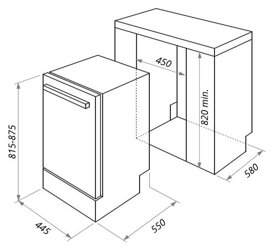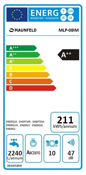 узкая, встраиваемая полностью, ширина 44.5 см; вместимость: 10 комплектов; 8 программ мойки; расход воды 9 л; конденсационная сушка класса A; таймер отсрочки запуска; класс энергопотребления A++; уровень шума при работе 47 дБ; полная защита от протечек