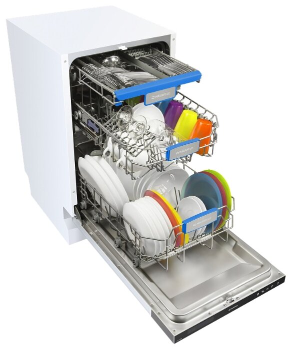 Брали как довесок к остальной технике (варочная панель и духовой шкаф). Сразу скажу, вся техника этой фирмы низкого качества. Что касается посудомойки, то фурнитура отвратительная. Что должно сниматься, не снимается, что не должно, отваливается. Установить посуду- целая проблема. То перекрывает отсек для моющего средства, то друг друга перекрывает, т.е. моет через один. Покупала для дачи, в квартире посудомойка тех же габаритов, но другого производителя. Нареканий нет. И ещё с дверцей проблемы. Не держится в горизонтальном положении. Надо придерживать или ногой, или корзиной. А то прибьёт, закрываясь. Несколько мастеров пытались отрегулировать винт, ничего не вышло. Категорически не рекомендую. Достоинства: