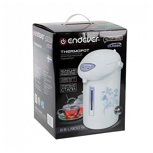 объем 2.8 л; мощность 900 Вт; индикация включения; закрытая спираль; заварочный чайник в комплекте; пластиковый корпус; ненагревающийся корпус; выбор температуры нагрева воды