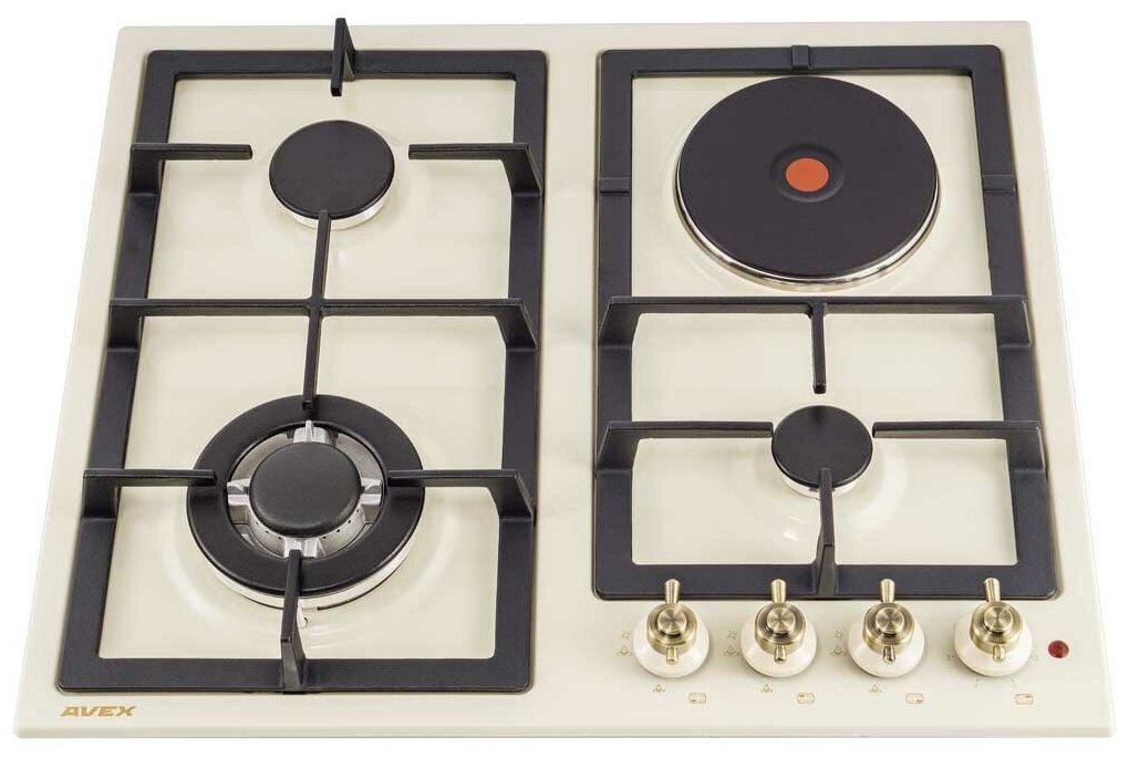 тип панели: комбинированная, количество конфорок: 4, материал панели: нержавеющая сталь/эмаль, установка: независимая, переключатели: поворотные, ширина: 58 см, глубина: 50 см, специальные конфорки: Тройная корона, электроконфорка, максимальная потребляемая мощность: 9.80 кВт