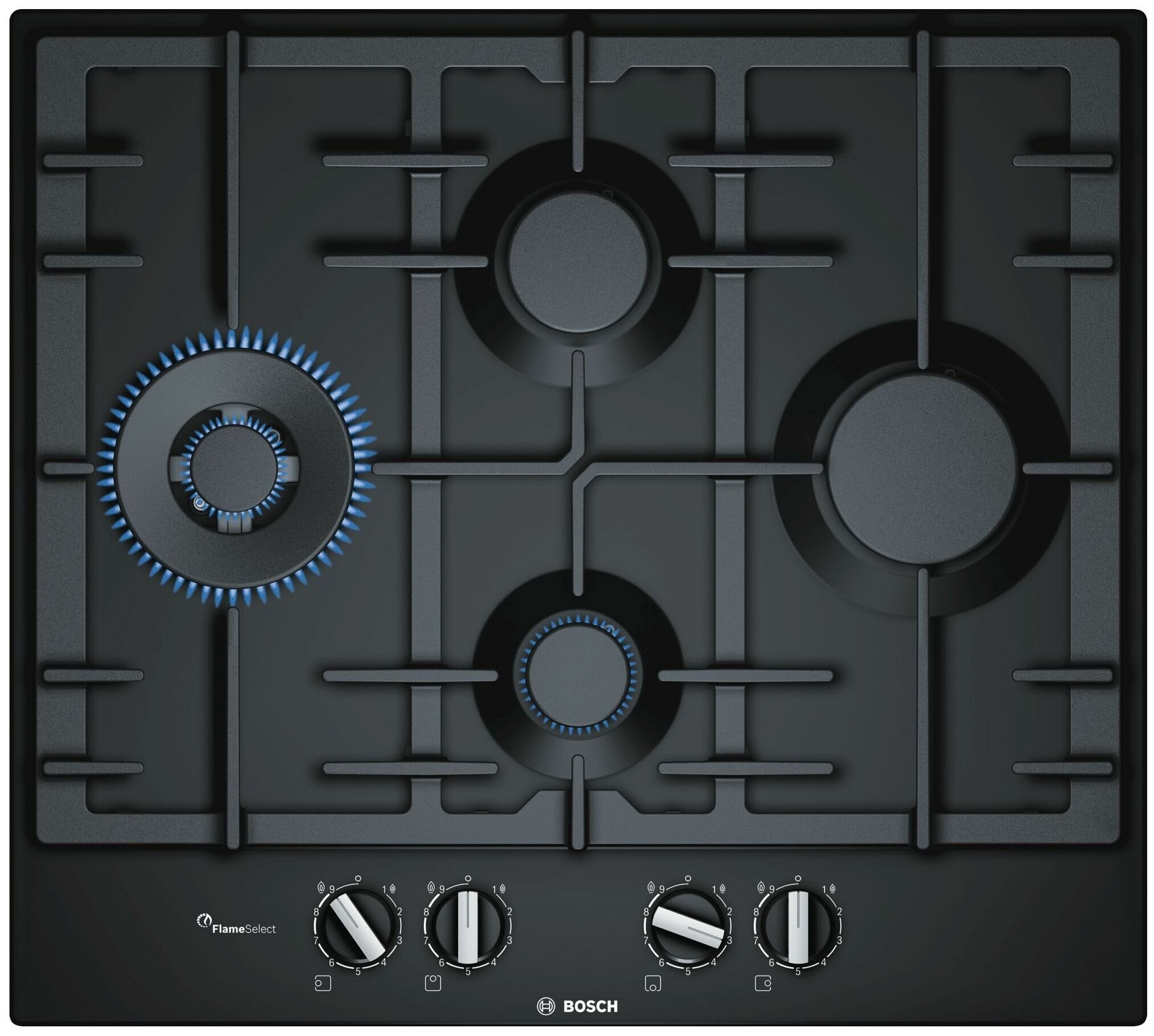 тип панели: газовая, количество конфорок: 4, материал панели: эмаль, установка: независимая, переключатели: поворотные, ширина: 58 см, глубина: 52 см, специальные конфорки: Двойная корона, экспресс-конфорка, газ-контроль конфорок