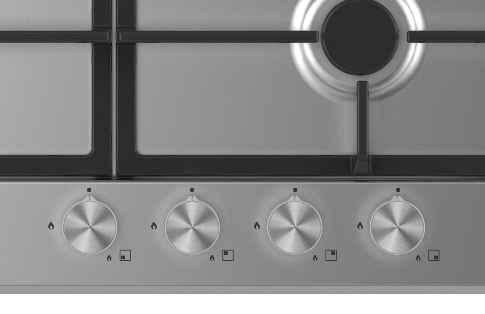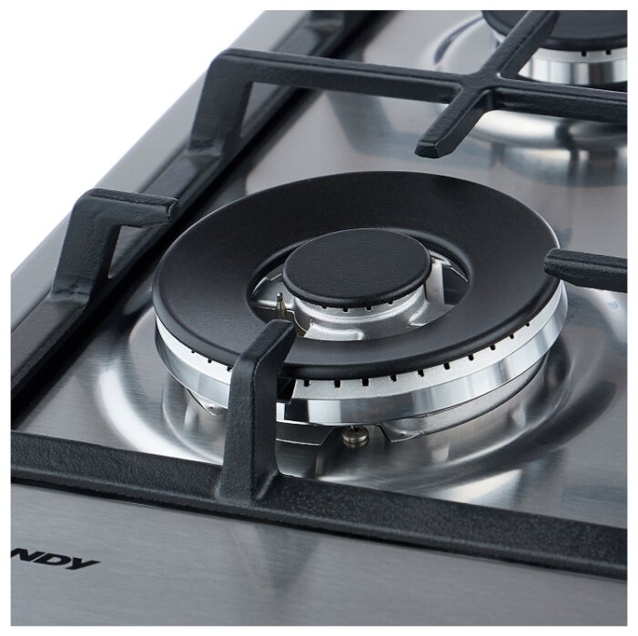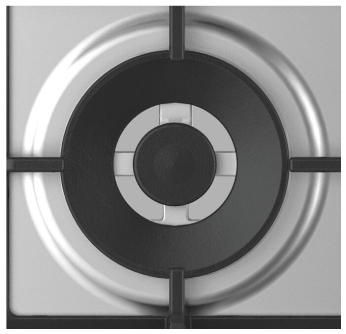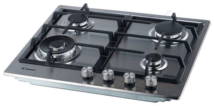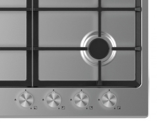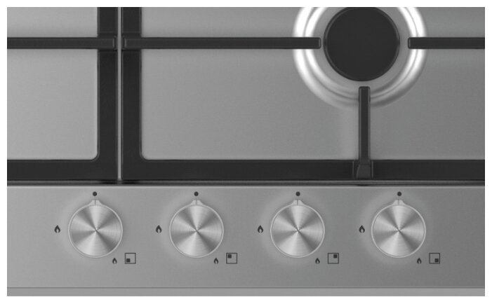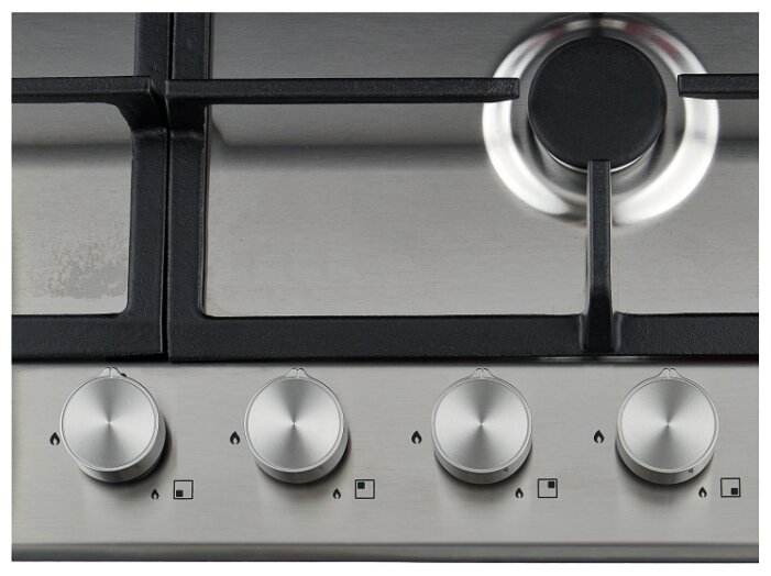 поверхность из нержавеющей стали; 4 конфорки; независимая установка; электроподжиг; газ-контроль; чугунные решетки; поворотные переключатели; ШхГ: 59.50х51 см
