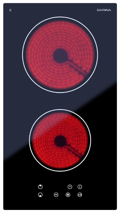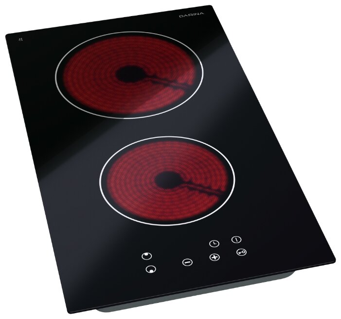 стеклокерамическая поверхность; 2 конфорки; независимая установка; защита от детей; сенсорные переключатели; кнопочное управление; индикатор остаточного тепла; ШхГ: 29х52 см