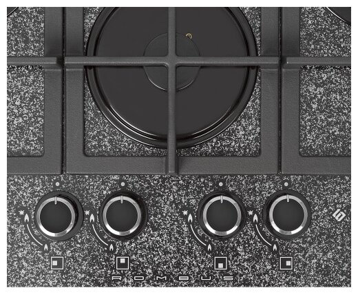 тип панели: газовая, количество конфорок: 4, материал панели: закаленное стекло, установка: независимая, переключатели: поворотные, ширина: 67 см, глубина: 52.50 см, специальные конфорки: Двойная корона, газ-контроль конфорок