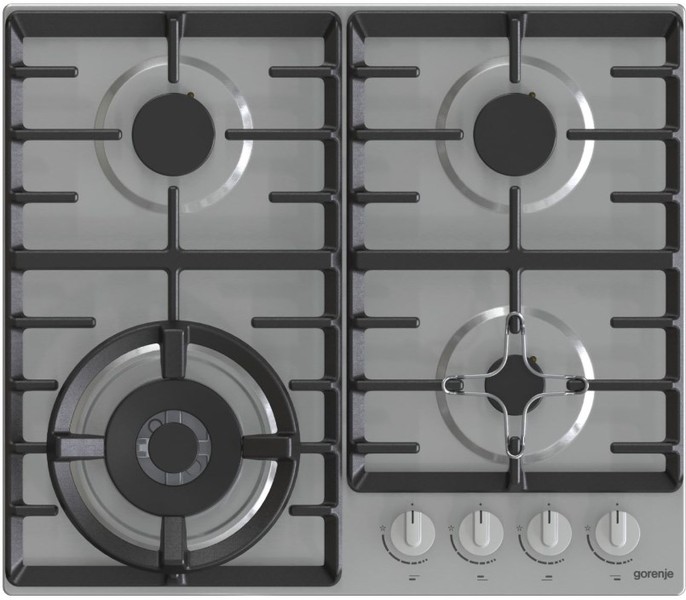 поверхность из нержавеющей стали; 4 конфорки; независимая установка; электроподжиг; газ-контроль; чугунные решетки; поворотные переключатели; ШхГ: 60х52 см