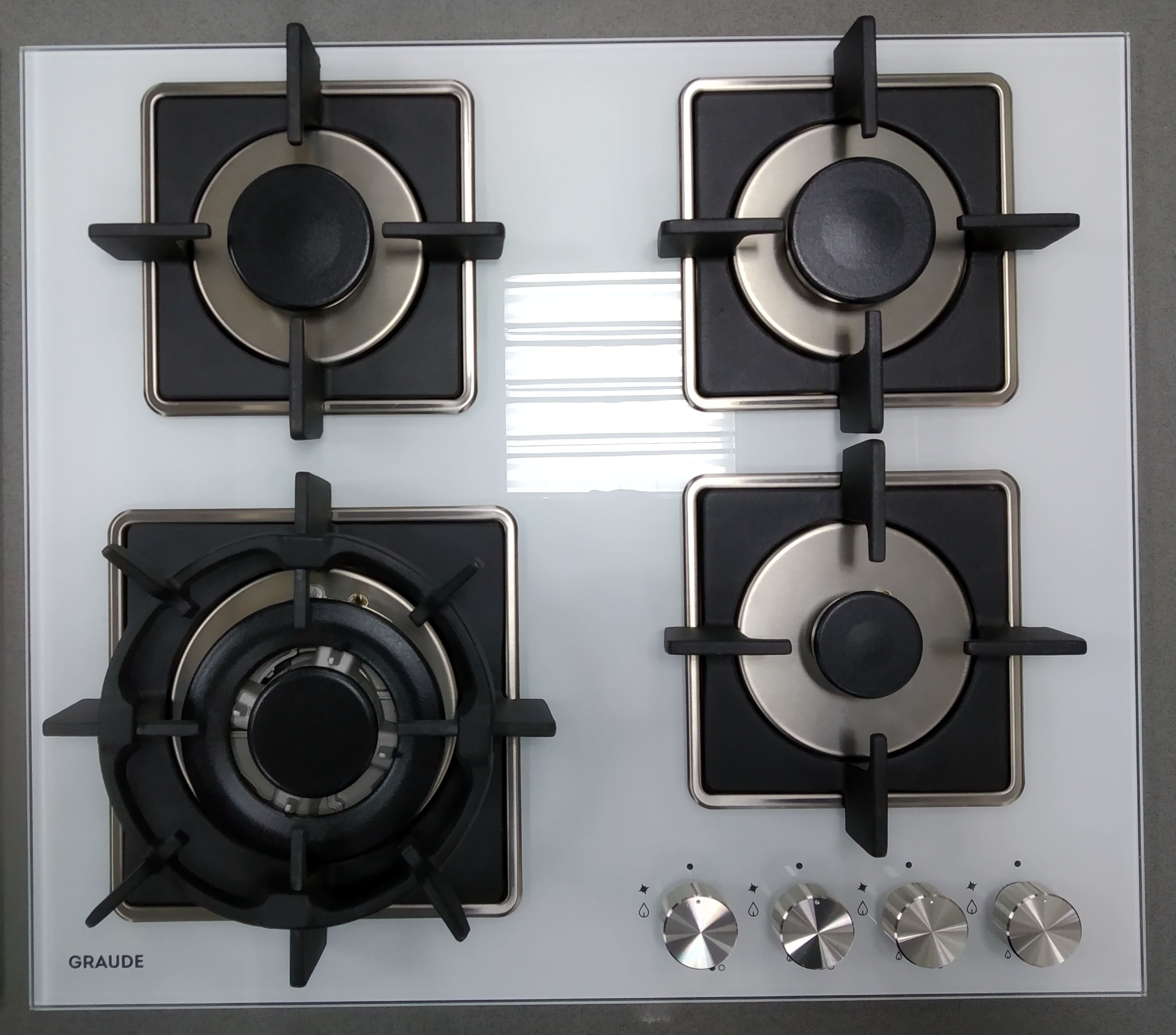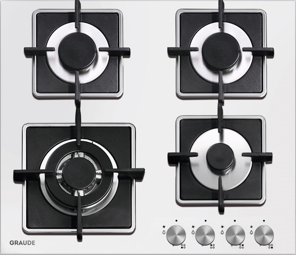 поверхность из закаленного стекла; 4 конфорки; независимая установка; электроподжиг; газ-контроль; чугунные решетки; поворотные переключатели; ШхГ: 59х51 см