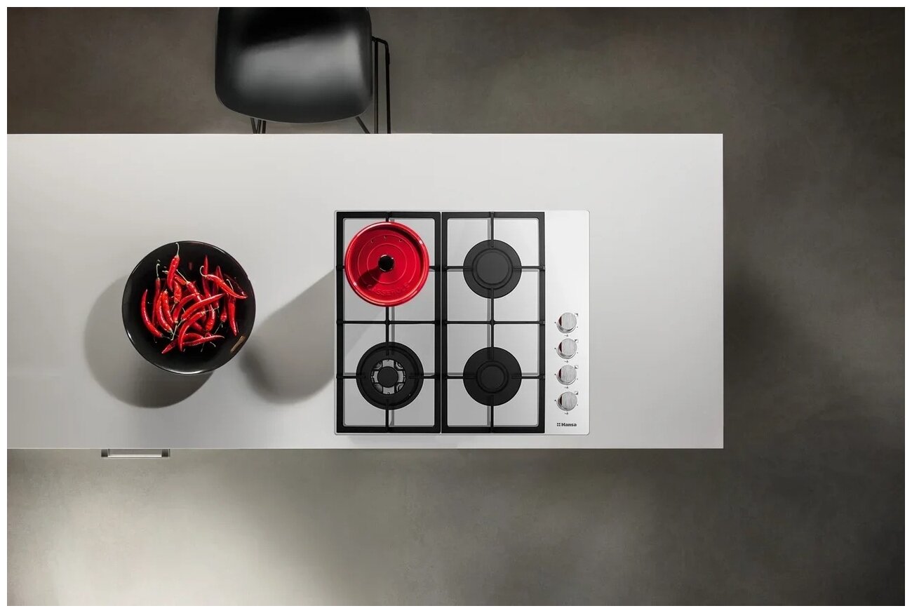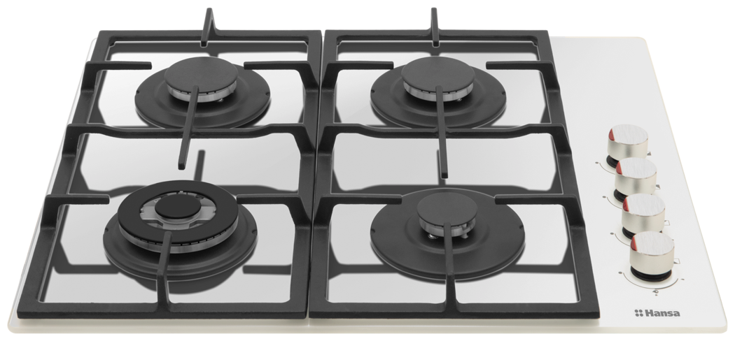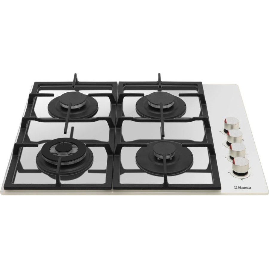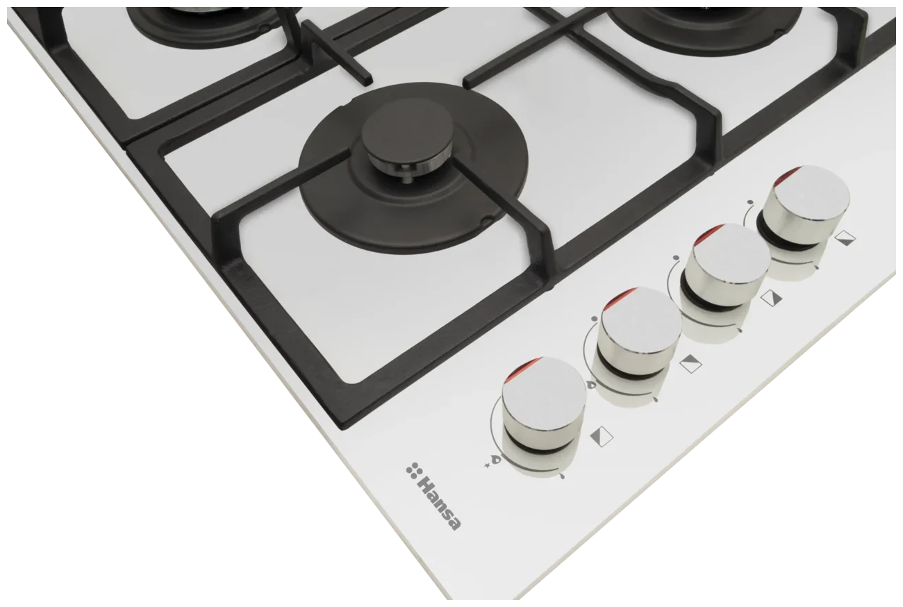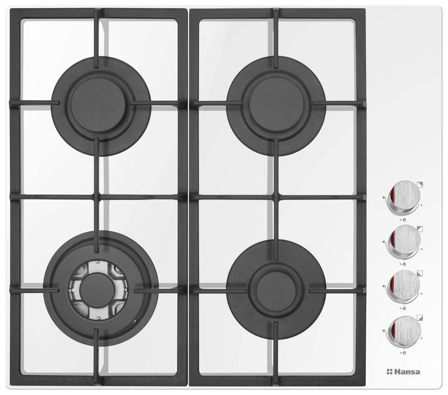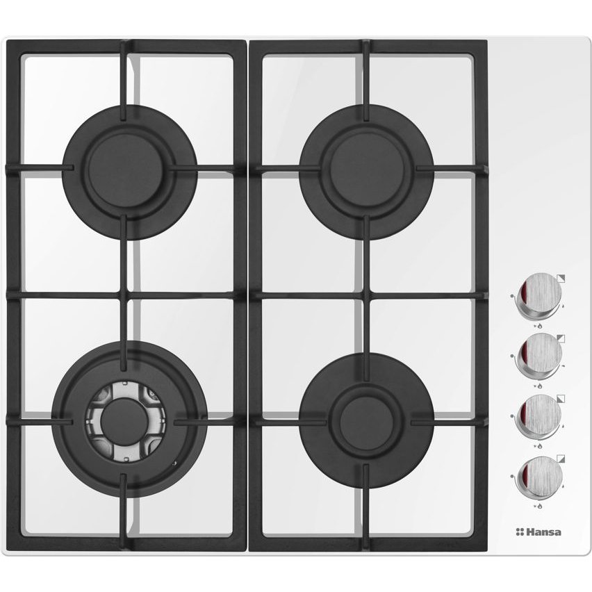 тип панели: газовая, количество конфорок: 4, материал панели: закаленное стекло, цвет панели конфорок: белый, установка: независимая, переключатели: поворотные, ширина: 59 см, глубина: 52 см, специальные конфорки: Двойная корона, газ-контроль конфорок