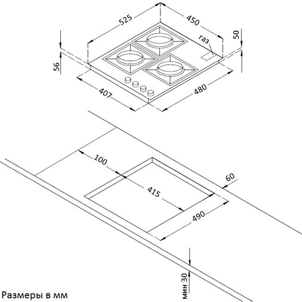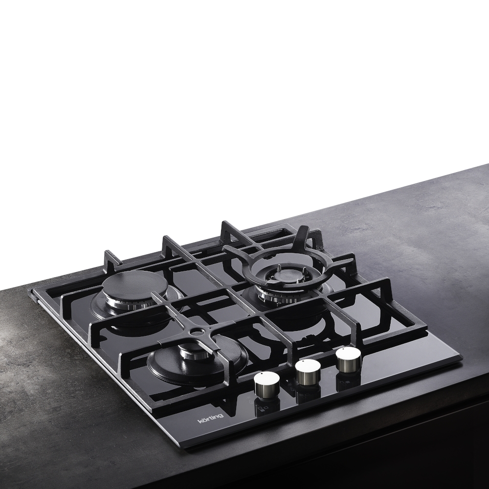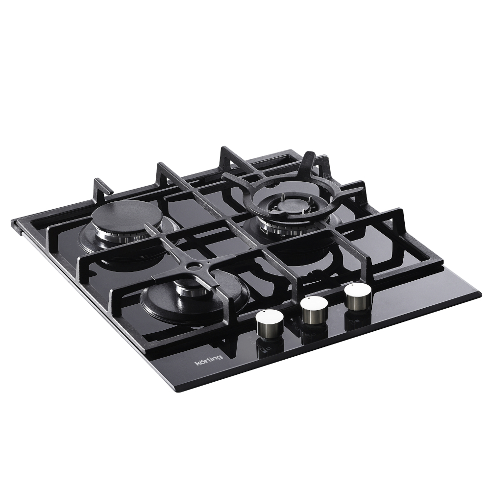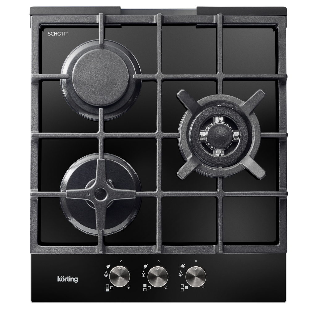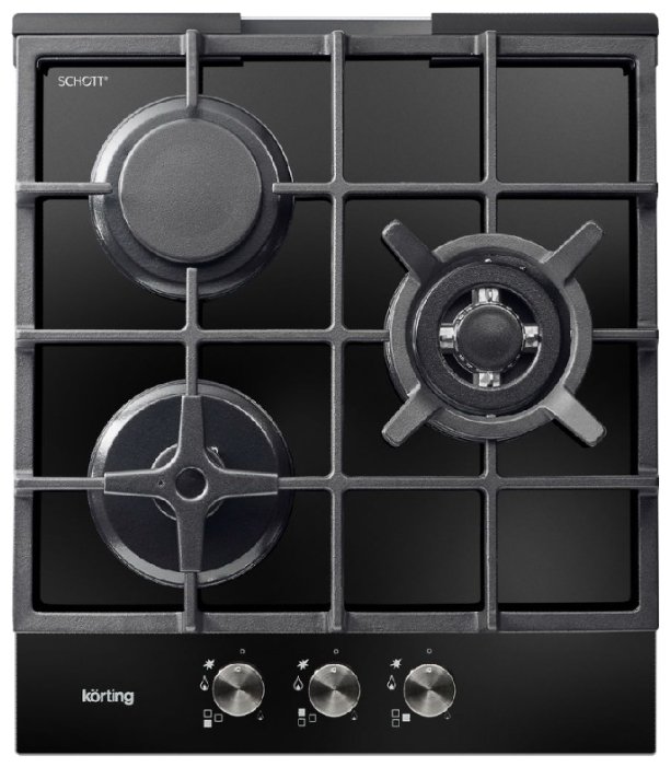 поверхность из закаленного стекла; 3 конфорки; независимая установка; электроподжиг; газ-контроль; чугунные решетки; поворотные переключатели; ШхГ: 45х52 см