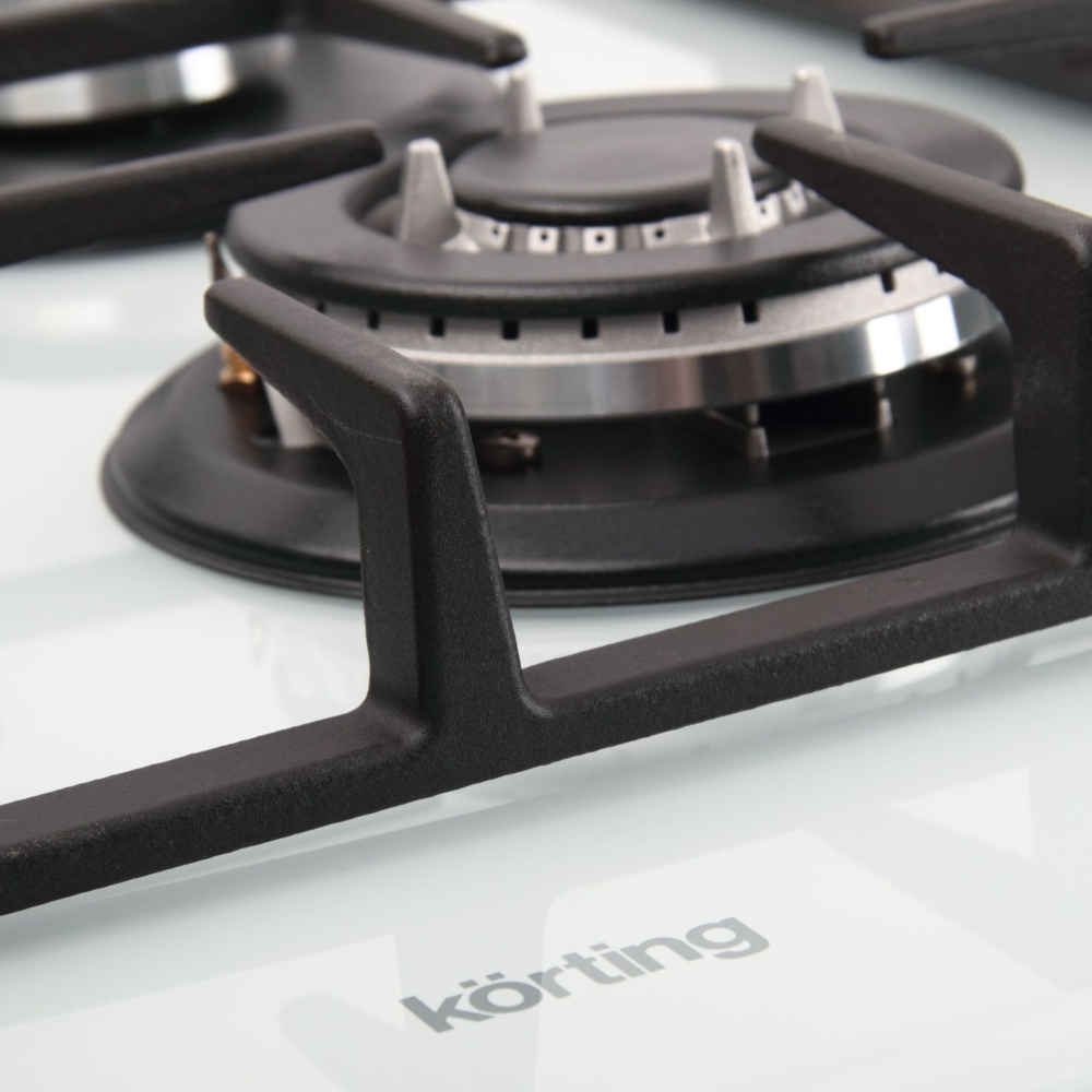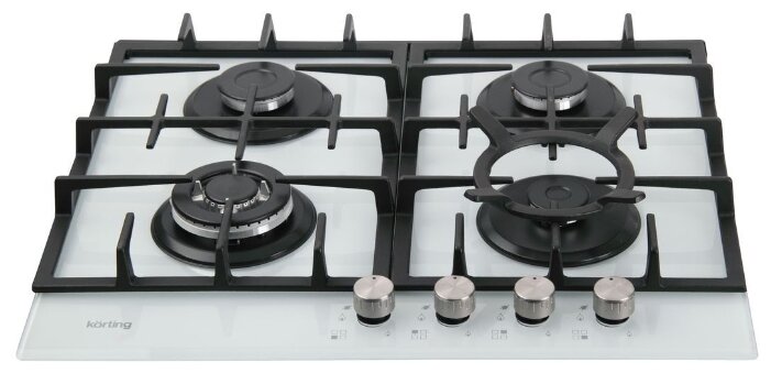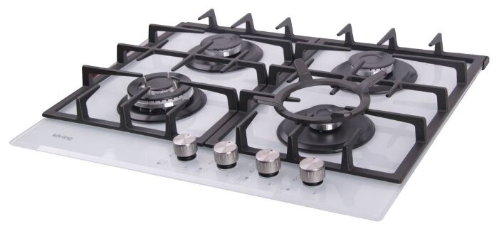 поверхность из закаленного стекла; 4 конфорки; независимая установка; электроподжиг; газ-контроль; чугунные решетки; поворотные переключатели; ШхГ: 59х52.50 см
