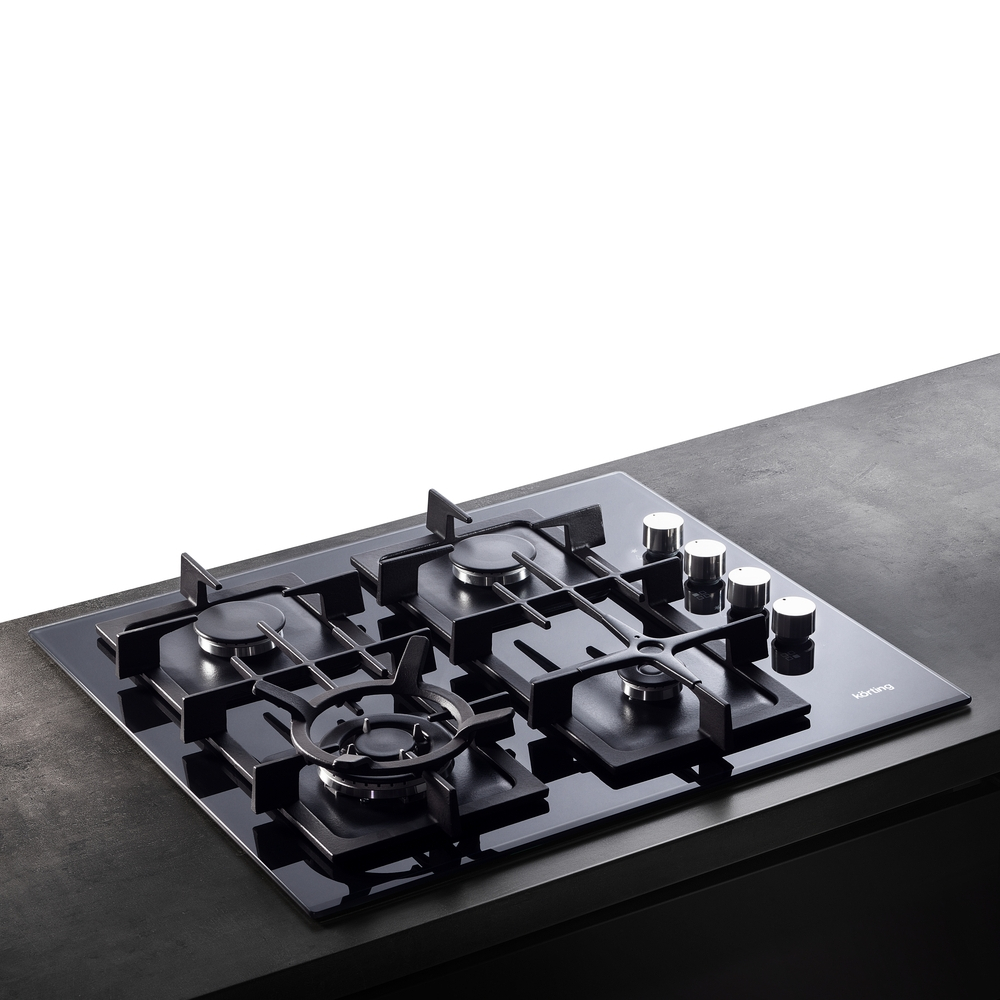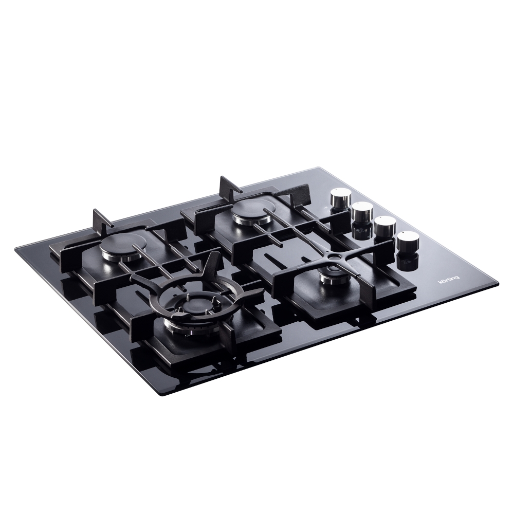 поверхность из закаленного стекла; 4 конфорки; независимая установка; электроподжиг; газ-контроль; чугунные решетки; поворотные переключатели; ШхГ: 58.50х50 см