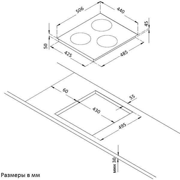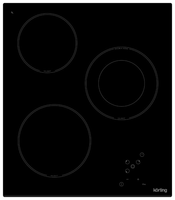 стеклокерамическая поверхность; 3 конфорки; независимая установка; защита от детей; сенсорные переключатели; кнопочное управление; индикатор остаточного тепла; ШхГ: 44х51 см
