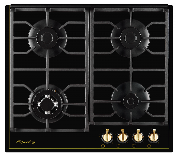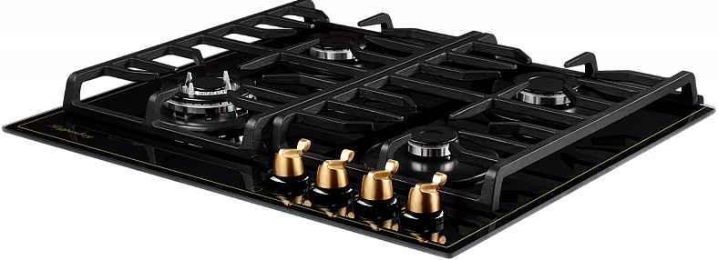 поверхность из закаленного стекла; 4 конфорки; независимая установка; электроподжиг; газ-контроль; чугунные решетки; поворотные переключатели; ШхГ: 60х52 см