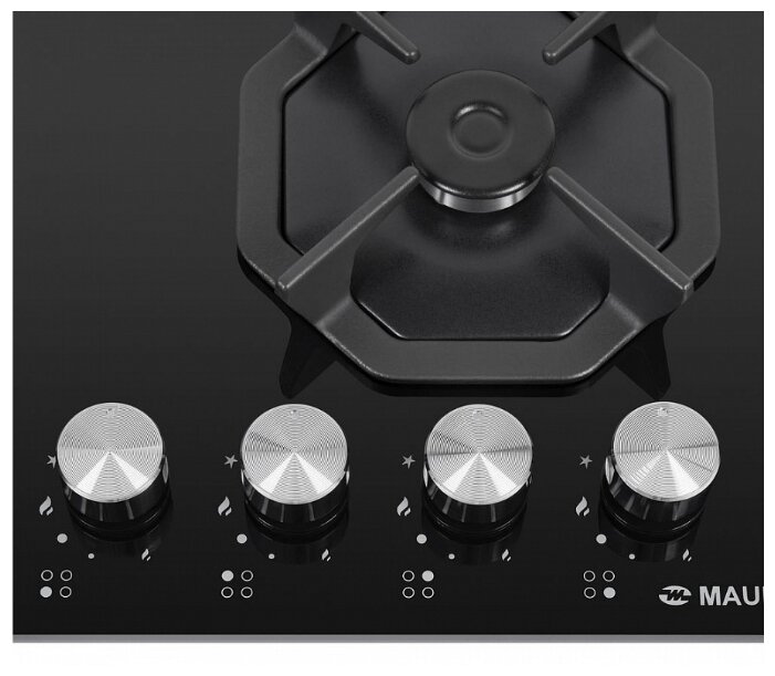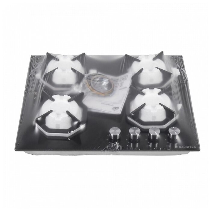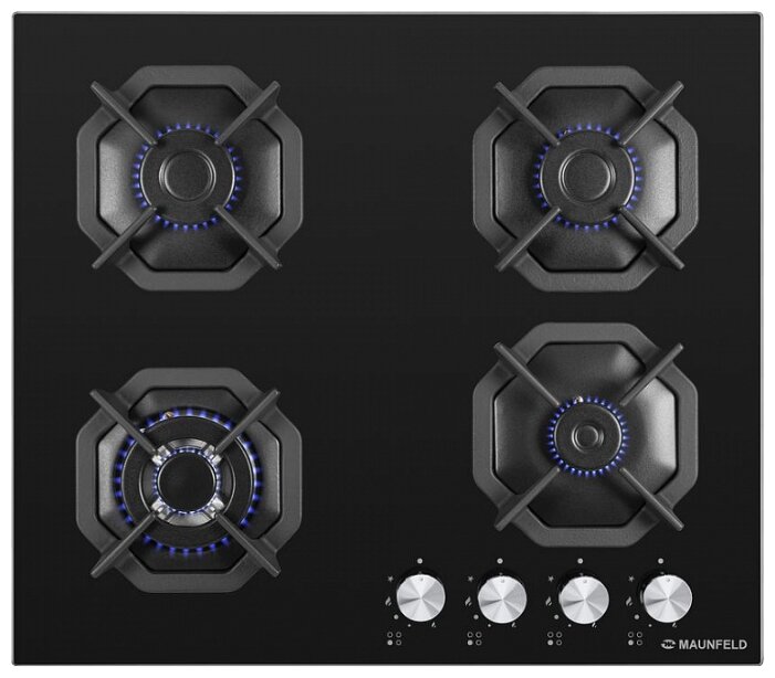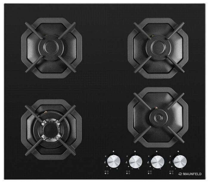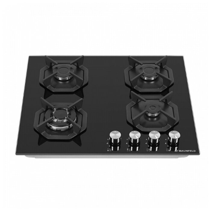 поверхность из закаленного стекла; 4 конфорки; независимая установка; электроподжиг; газ-контроль; чугунные решетки; поворотные переключатели; ШхГ: 59х51.50 см