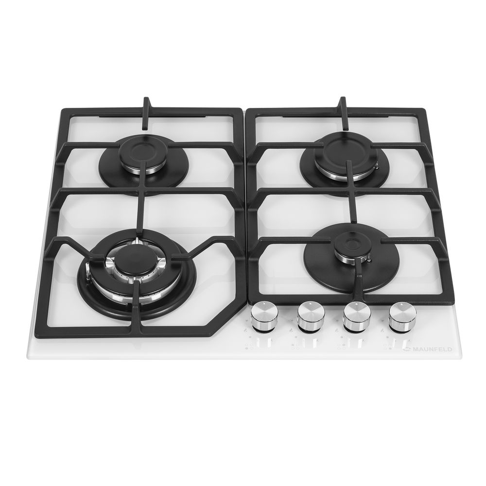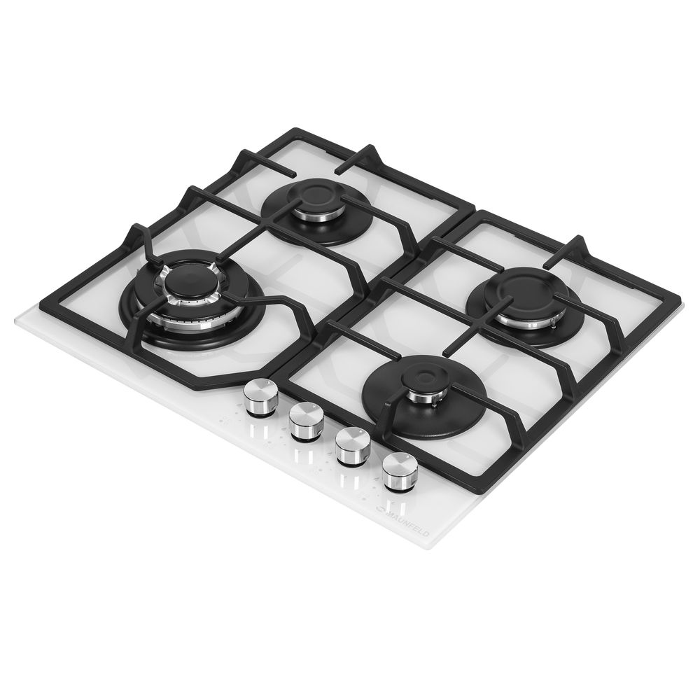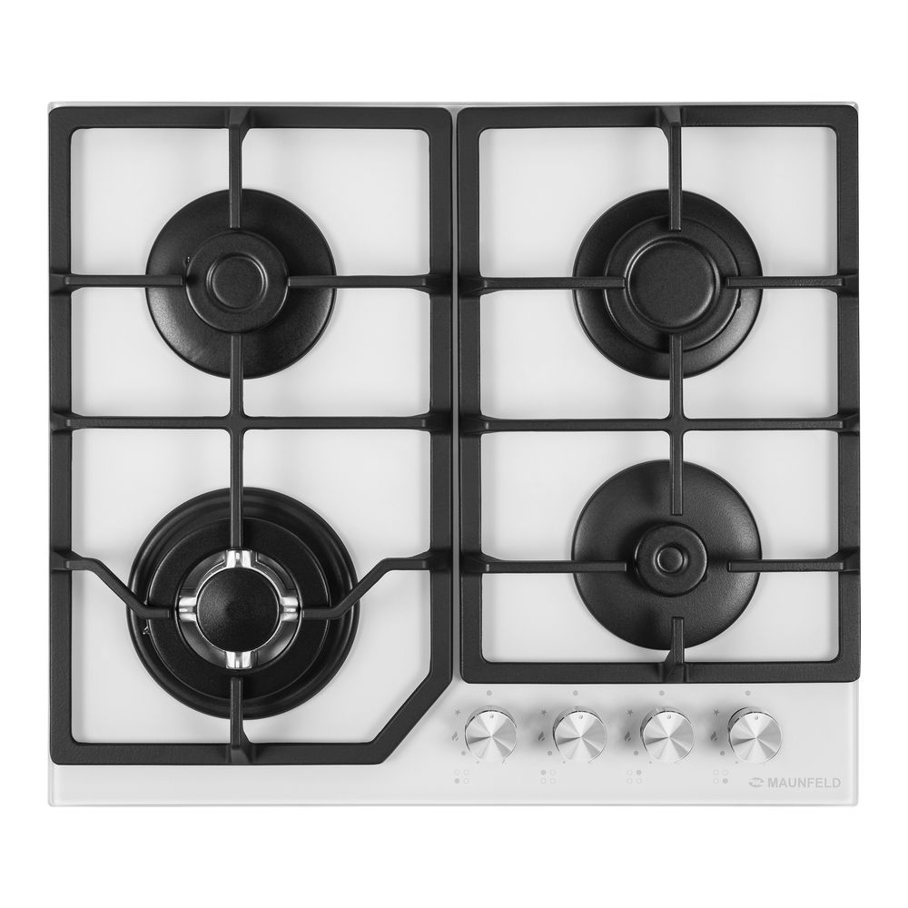 поверхность из закаленного стекла; 4 конфорки; независимая установка; электроподжиг; газ-контроль; чугунные решетки; поворотные переключатели; ШхГ: 59х51.50 см