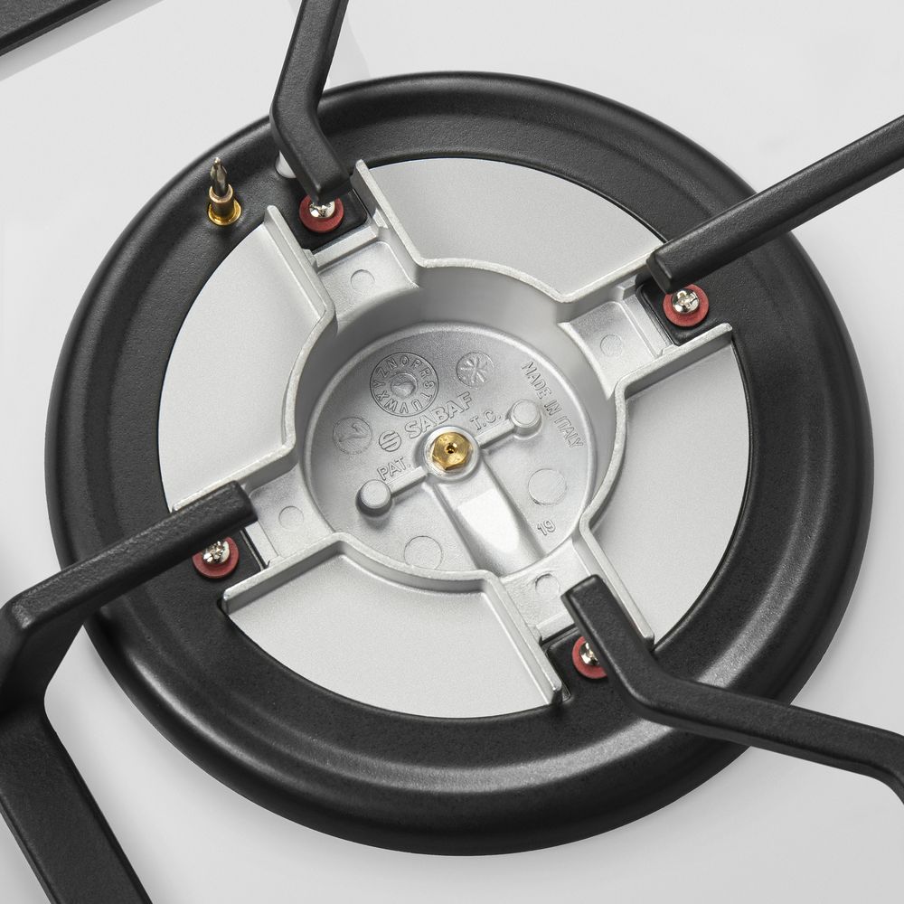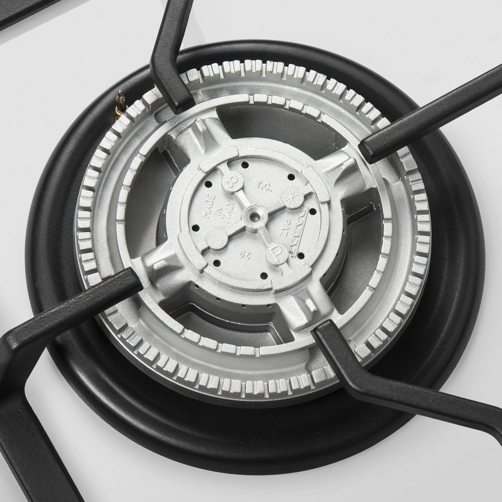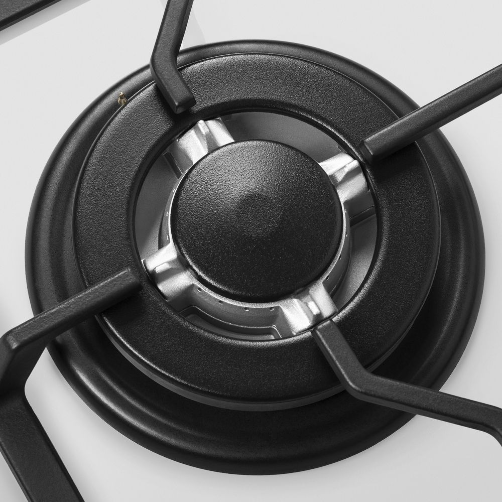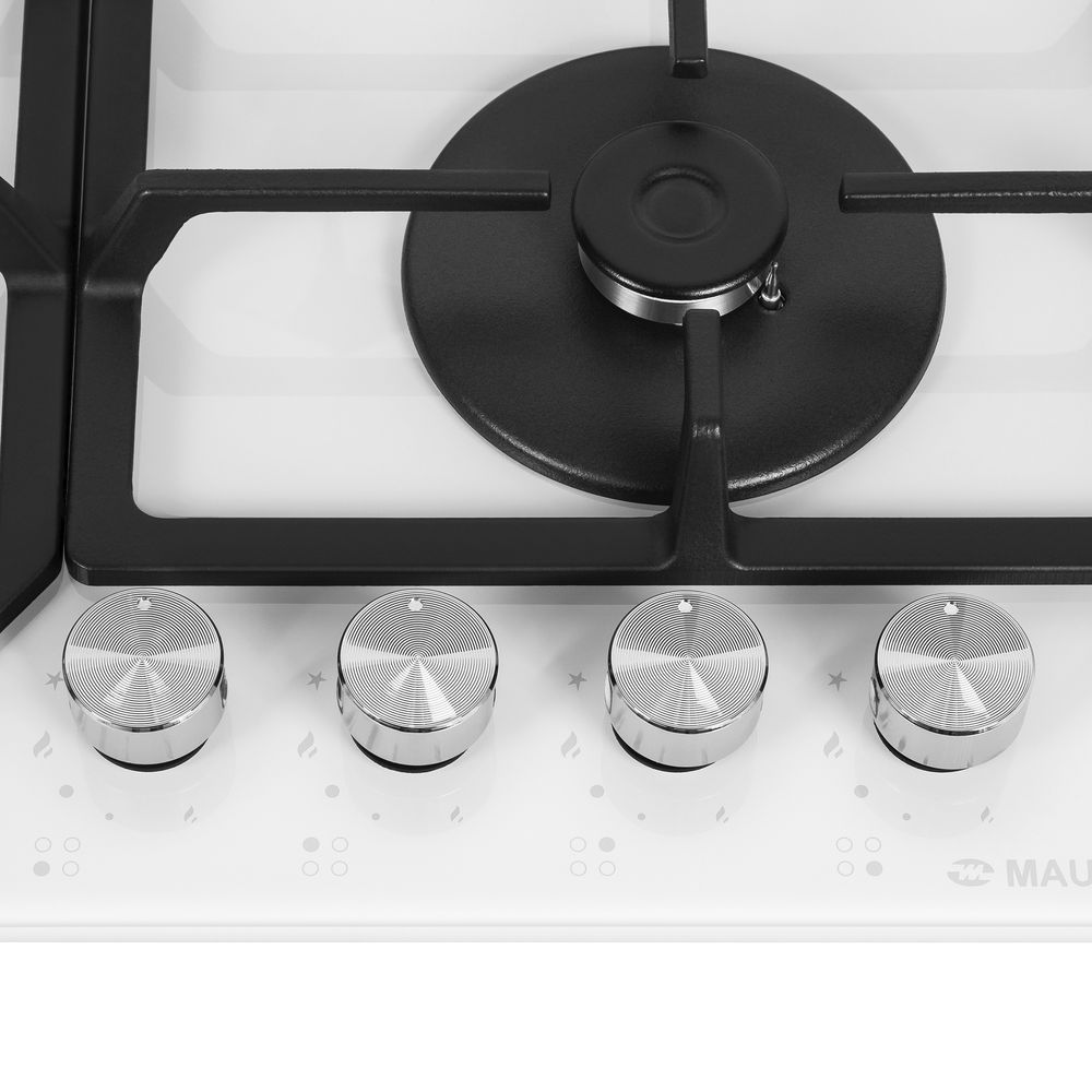 поверхность из закаленного стекла; 4 конфорки; независимая установка; электроподжиг; газ-контроль; чугунные решетки; поворотные переключатели; ШхГ: 59х51.50 см