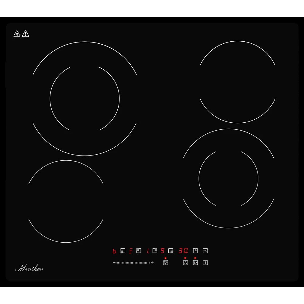 ОБЩИЕ ДАННЫЕ: Ширина, см: 59: Высота, см: 5.2: Глубина, см: 52: ОСНОВНАЯ ИНФОРМАЦИЯ: Управление: электронное сенсорное/слайдер: Размер ниши для встраивания (ШхГ), мм: 560x490: Автоматическое отключение: да: Блокировка панели управления: да: Индикаторы остаточного тепла: да: Стеклокерамика: KANGER: Количество уровней мощности: 9: Цвет: чёрный: Stop and Go: да: Наличие вилки: нет: ОСОБЕННОСТИ: Таймер: да: Длина сетевого шнура: 100 см: УСТАНОВКА: Мощность подключения, кВт: 6,5: КОНФОРКИ: Мощность конфорок, кВт: передняя левая: 1,2 кВт: Мощность конфорок, кВт: передняя правая: 1,8 кВт: Мощность конфорок, кВт: задняя левая: 1,8 кВт: Мощность конфорок, кВт: задняя правая: 1,2 кВт: Диаметр зон, мм. передняя левая: 165 мм: Диаметр зон, мм. передняя правая: 200 мм: Диаметр зон, мм. задняя левая: 200 мм: Диаметр зон, мм. задняя правая: 165 мм: ФУНКЦИИ: Тип нагрева: Hi-Light;;
