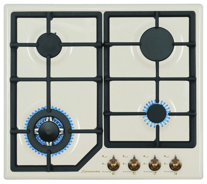 эмалированная поверхность; 4 конфорки; независимая установка; электроподжиг; газ-контроль; чугунные решетки; поворотные переключатели; ШхГ: 58х51 см