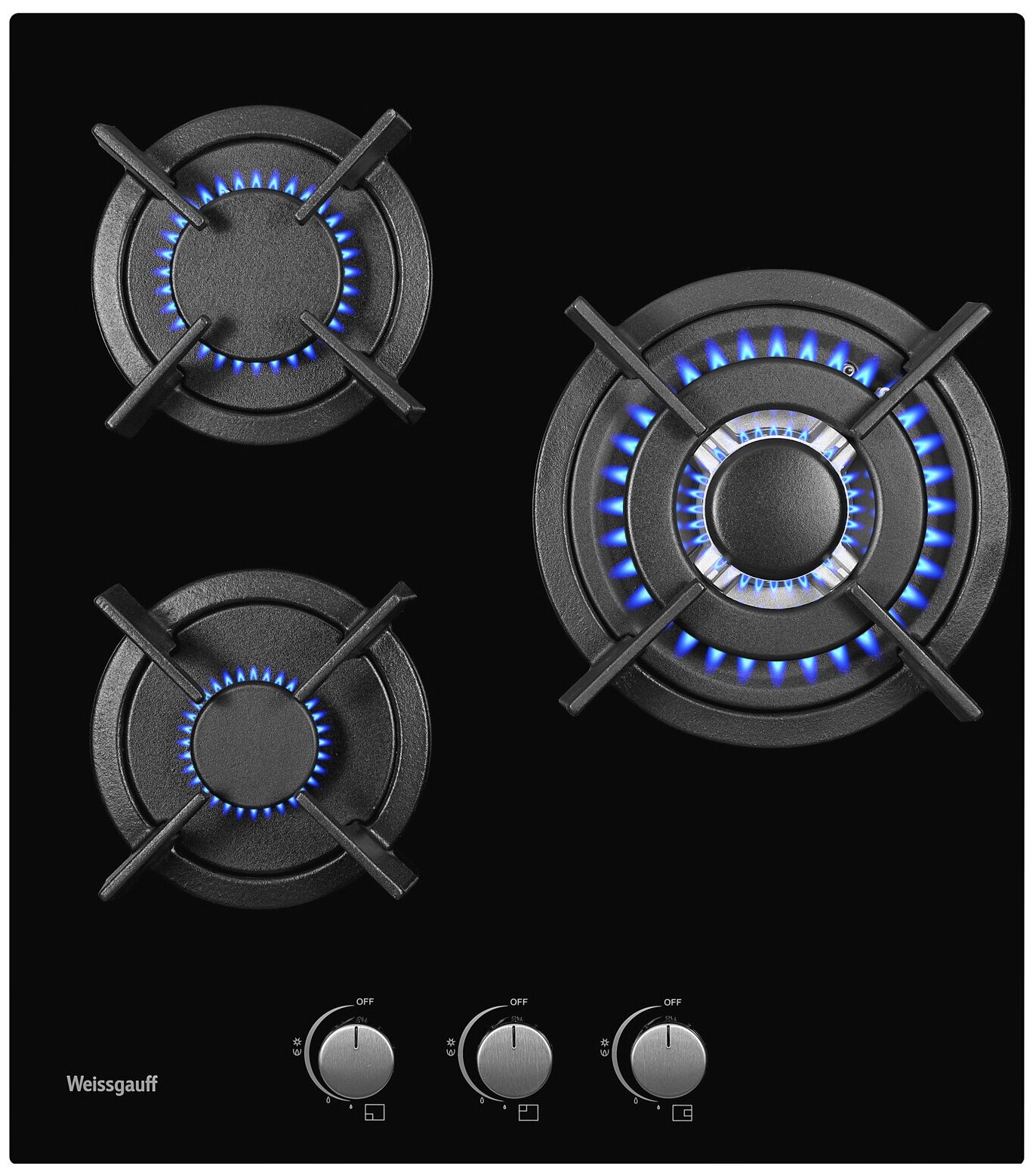 материал панели: закаленное стекло; количество конфорок: 3; установка: независимая; электроподжиг: есть; газ-контроль: есть; чугунные решетки: есть; переключатели: поворотные; ШхГ: 45х51 см