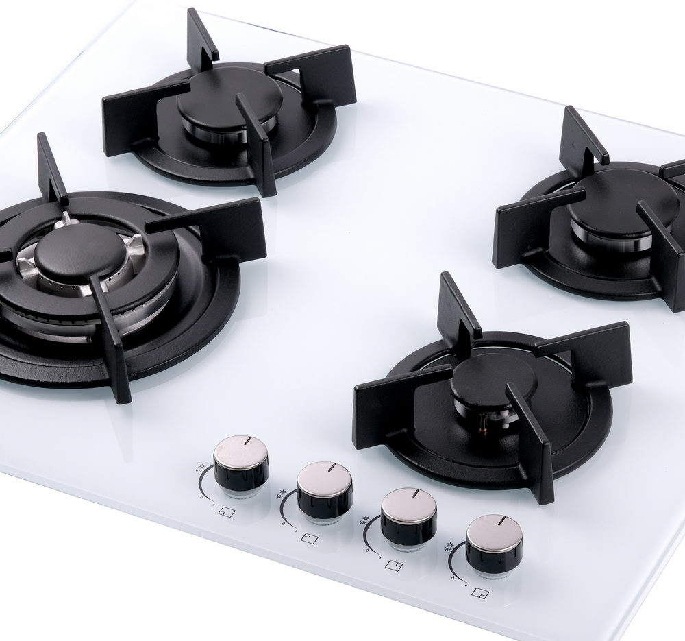 поверхность из закаленного стекла; 4 конфорки; независимая установка; электроподжиг; газ-контроль; чугунные решетки; поворотные переключатели; ШхГ: 58.40х51 см
