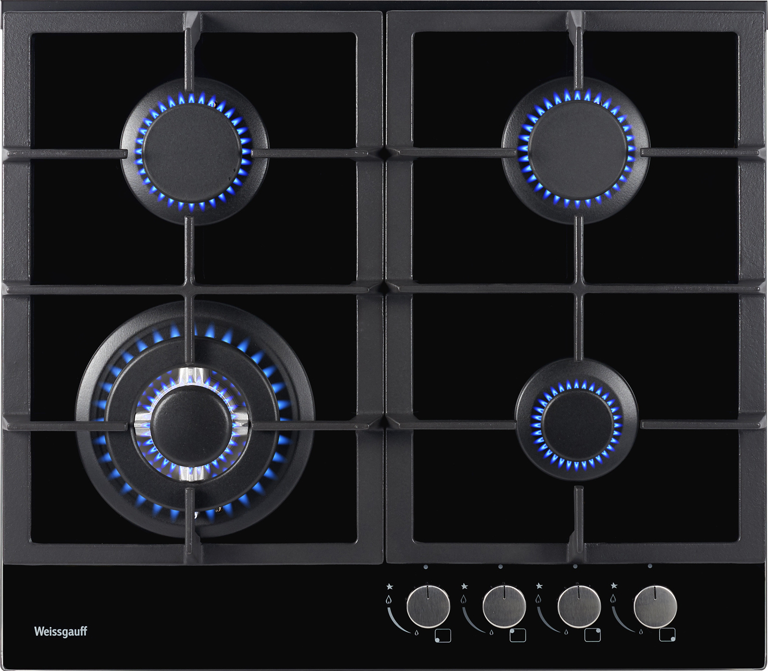 поверхность из закаленного стекла; 4 конфорки; независимая установка; электроподжиг; газ-контроль; чугунные решетки; поворотные переключатели; ШхГ: 58.40х51 см