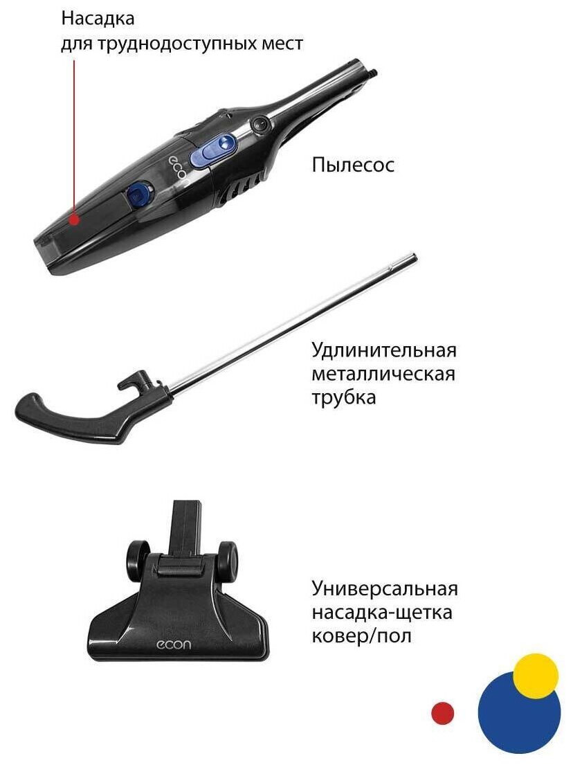- Насадки в комплекте: Универсальная щетка ковер/пол, насадка для труднодоступных мест