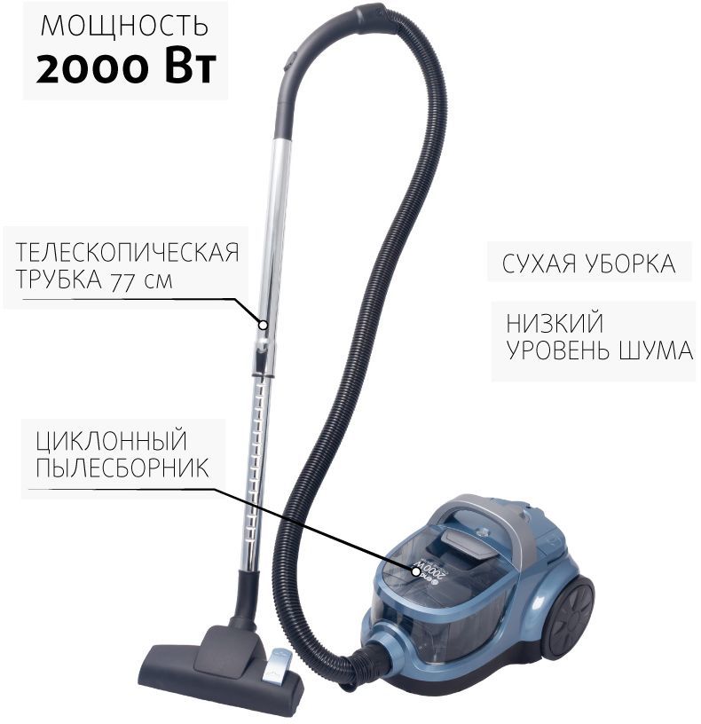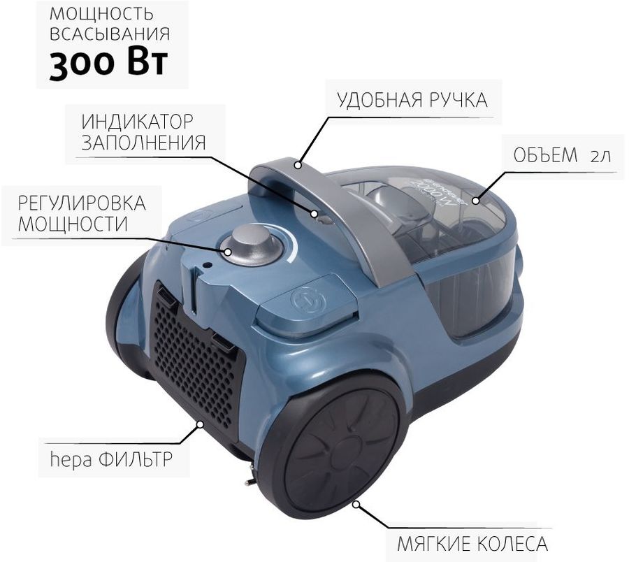 мощность всасывания: 300 Вт; потребляемая мощность: 2000 Вт; фильтр тонкой очистки в комплекте; индикатор заполнения пылесборника, регулятор мощности на корпусе; телескопическая труба всасывания; ШхВхГ: 40.80x29.50x27 см