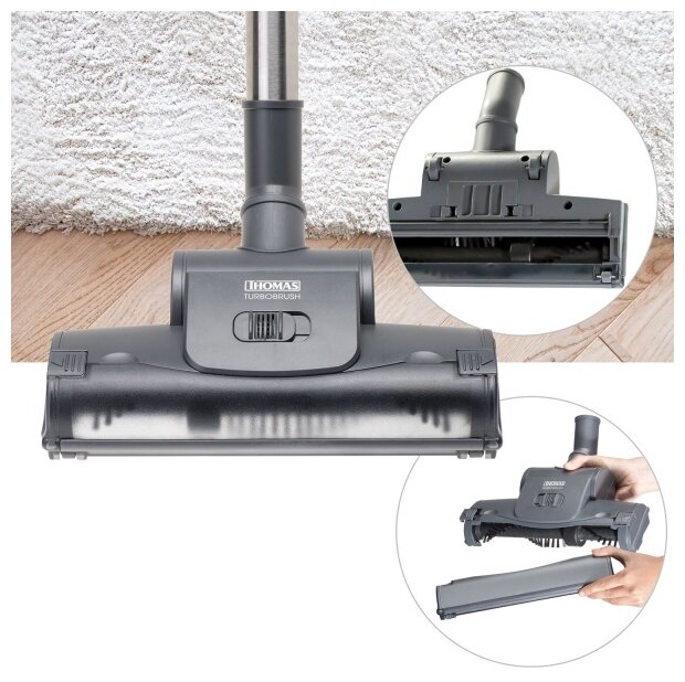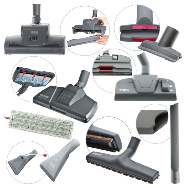 - Насадки в комплекте: пол/ковер; Aqua Stealth для влажной уброки; паркетная из конского волоса; для чистки мягкой мебели;