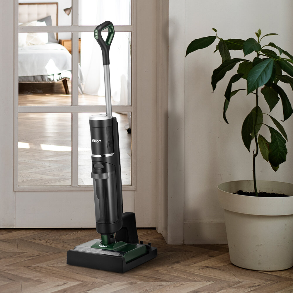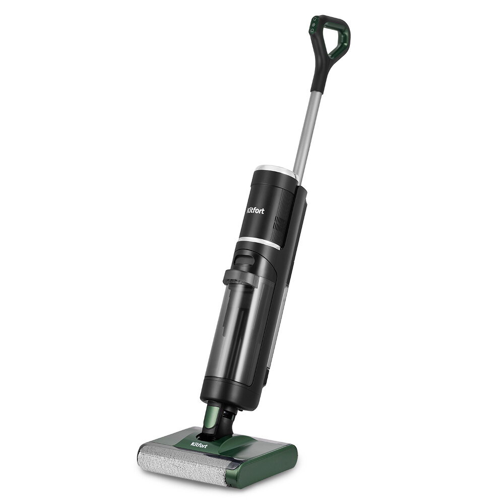 Общие характеристики: Бренд: Kitfort: Цвет товара: черный: Тип уборки: влажная, сухая: Тип пылесборника: контейнер: Объем пылесборника: 0.8 л: Дополнительные функции: функция сбора жидкостей: Особенности конструкции: вертикальная парковка, функция самоочистки: Питание: Тип питания: от аккумулятора: Тип аккумулятора в комплекте: Li-Ion: Потребляемая мощность: 200 Вт: Комплектация: В комплекте: удлинительная трубка/шланг, фильтр тонкой очистки, блок фильтров, валики турбощётки, резервуар для воды, щетка для очистки: Дополнительные характеристики: Уровень шума: 74 дБ: Габариты и вес: ШхВхГ: 27.80x111x22.70 см: Вес: 5.96 кг;;