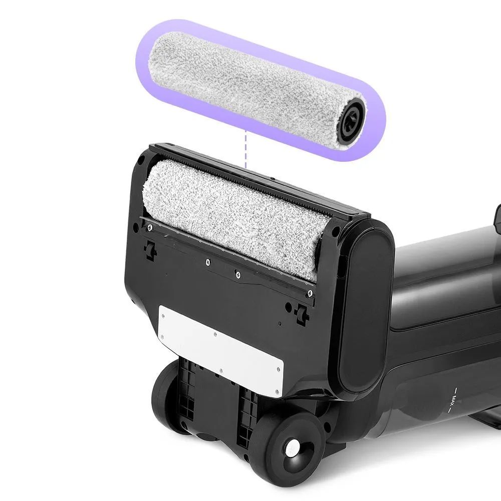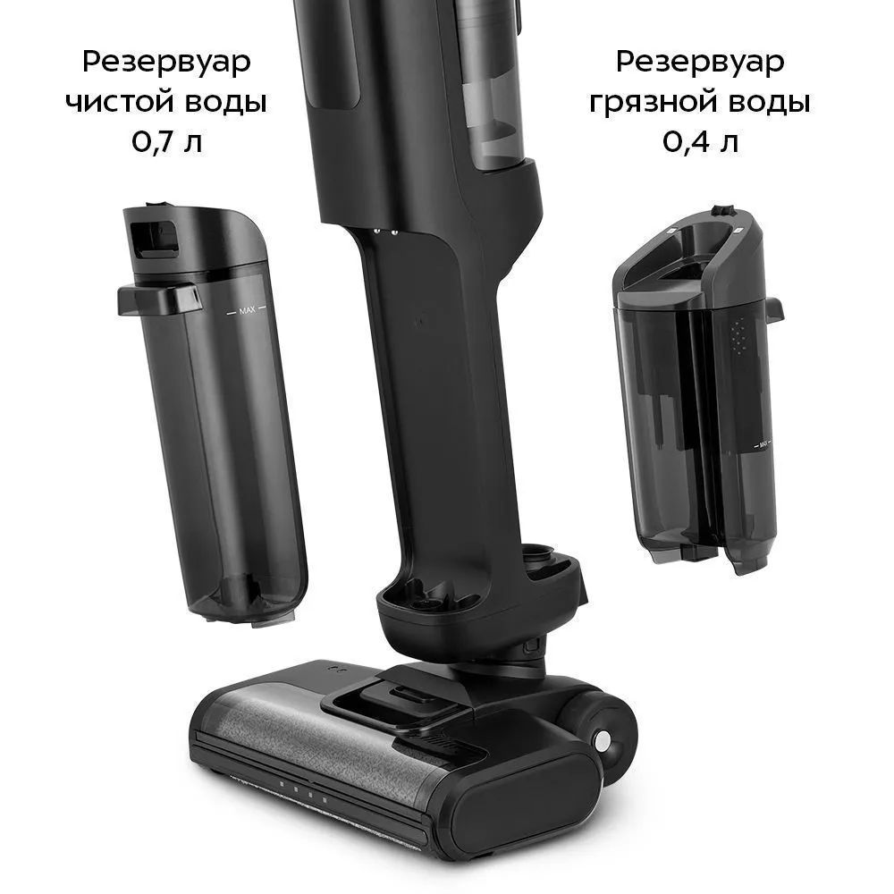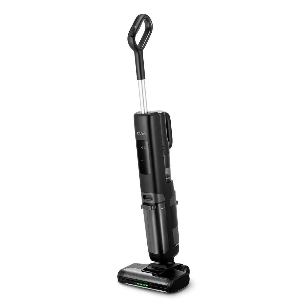 Беспроводной вертикальный моющий пылесос «3 в 1» КТ-5268 очень удобен при проведении влажной и сухой уборки. Благодаря работе от аккумулятора во время использования пылесос не нужно включать в сеть и провода не будут мешать под ногами.: Турбощётка моющего пылесоса предназначена только для сухой или влажной уборки гладких напольных покрытий внутри помещений и не подходит для уборки ковровых покрытий и мягкой мебели или для уборки на улице.: Принцип работы пылесоса прост: благодаря непрерывному вращению валика вода равномерно распределяется по поверхности пола, а затем всасывается пылесосом в резервуар для грязной воды, а подсветка позволит увидеть пыль и мусор в плохо освещённых зонах.: Пылесос оснащён двумя дисплеями: на ручном модуле и основной части пылесоса. На них вы можете наблюдать за уровнем заряда устройства. Кнопки Вкл/Выкл, Подача воды и Самоочистка так же находятся на ручке пылесоса.: В моющем пылесосе КТ-5268 есть 2 съёмных резервуара для грязной и чистой воды. Оба резервуара легко снимаются и очи