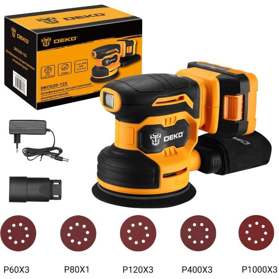 Бренд; DEKO; Модель; DKCG20-125; Тип; Эксцентриковая шлифмашина; Диаметр тарельчатого шлифкруга; 125 мм; Число оборотов холостого хода; 7000 - 13000 об/мин; Диапазон колебаний; 2 мм; Крепление рабочего шлифматериала; липучка; Патрубок для системы пылеудаления; есть; Рукоятка с мягкой накладкой ; есть; Аккумулятор в комплекте; в комплекте; Зарядное устройство в комплекте; в комплекте; Особенности; Удобная рукоятка делает работу оператора комфортной. Наличие пылесборника и возможности подключить пылесос к инструменту позволяет всегда содержать в чистоте рабочее место. Удобный способ крепления шлифовальных кругов - липучка.; Тип питания; от аккумулятора; Тип аккумулятора; Li-Ion; Емкость аккумулятора; 2 Ач; Напряжение аккумулятора; 20 В; Длина инструмента; 210 мм; Высота инструмента; 160 мм; Вес; 1.76 кг; Комплект поставки; Шлифмашина, акб, зарядное устройство для АКБ, шлифовальные круги - 5 шт., патрубок для подключения пылесоса, пылесборник.; Страна производства; Китай; Габариты упаковки (ед) ДхШхВ; 0.21x0.14