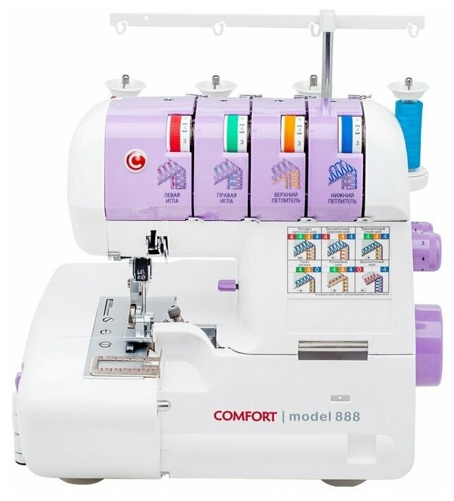 Много строчек, всё нужные аксессуары для оверлока у комплекте