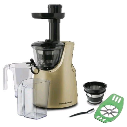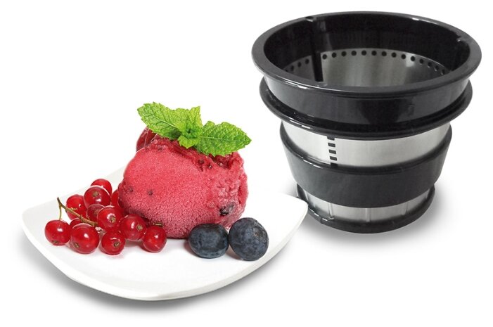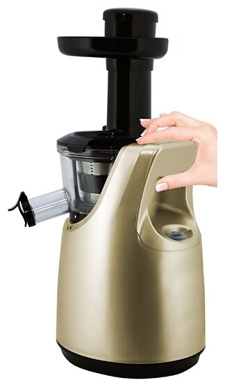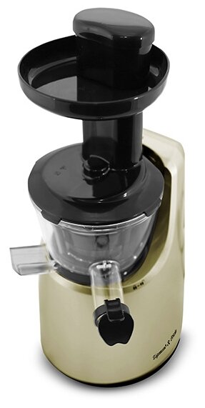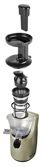 вертикальная шнековая соковыжималка; количество шнеков: 1; мощность 180 Вт; стакан для сока в комплекте; подача сока сразу в стакан; противокапельная система; автоматический выброс мякоти