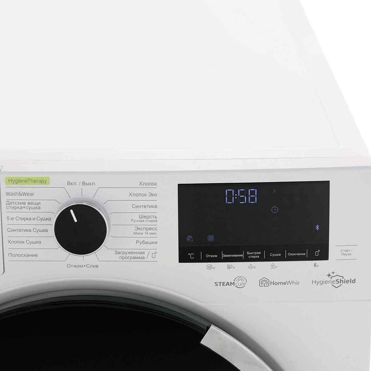 Установка отдельностоящая; Конструкция стиральной машины полноразмерная; Количество барабанов 1; Тип двигателя инверторный; Основной барабан; Тип загрузки фронтальная; Максимальная загрузка белья 8 кг; Максимальная скорость отжима до 1400 об/мин; Класс стирки A; Класс отжима A; Уровень шума при стирке 57 дБ; Уровень шума при отжиме 77 дБ; Сушка; Сушка есть; Количество программ сушки 6; Максимальная загрузка белья при сушке до 5 кг; Программы сушки хлопок, синтетика, стирка + сушка, функция освежения; Дополнительные программы Wash&Dry, детские вещи стирка+сушка; Управление; Тип управления электронное; Переключатели кнопочные, сенсорные; Размещение панели управления горизонтальное; Количество программ 9; Программы хлопок, синтетика, шерсть/ручная стирка, Эко 40-60°С, экспресс, рубашки, загруженная программа, полоскание, отжим+слив; Дополнительные программы замачивание, быстрая стирка, настраиваемая программа, защита от сминания; Функция пар да; Поддержка Bluetooth да; Управление c мобильного устройства да; Под