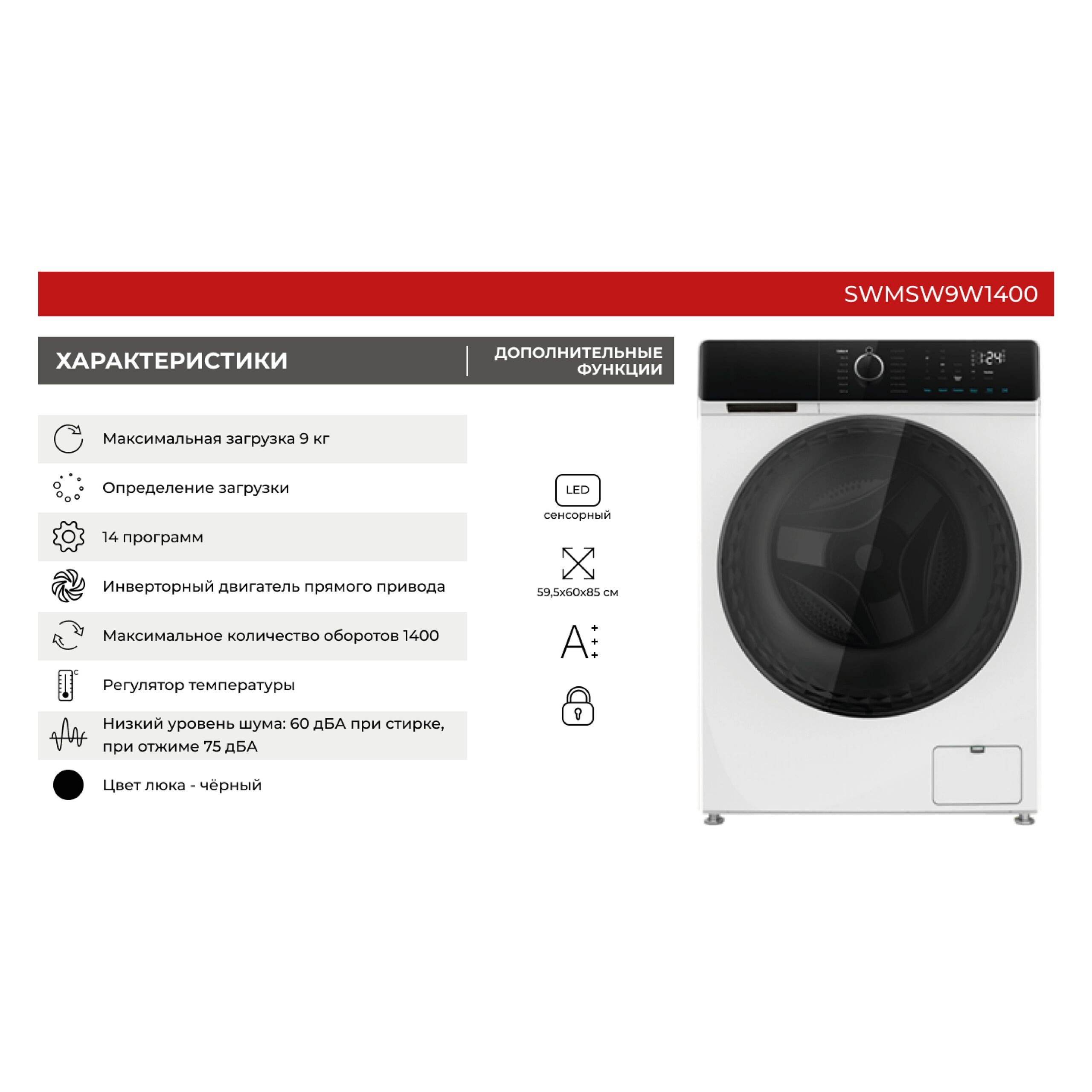 Страна-производитель: Китай: Общие параметры: Тип: стиральная машина: Модель: SMILE SWMSW9W1400: Вид: автомат: Основной цвет: белый: Дополнительный цвет: черный: Габариты и вес: Ширина (см): 59.5: Высота (см): 85: Глубина (см): 60: Вес (кг): 66: Габариты в упаковке (ШxВxГ): 66х88,5х67: Вес в упаковке (кг): 71: Основные характеристики: Тип загрузки: фронтальная: Загрузка белья для стирки и отжима (кг): 9: Сушка: нет: Прямой привод: да: Инверторный двигатель: да: Дисплей: да: Тип управления: поворотный механизм, сенсорное: Язык панели управления: русский: Изменение температуры стирки: да: Диапазон температур (°C): 20-90: Уровень шума при стирке (дБ): 60: Расход воды за стирку (л): 55: Диаметр загрузочного люка (см): 52.3: Угол открывания люка (градус) (°): 150: Функционал: Функциональные особенности: обработка паром, самодиагностика: Количество программ стирки: 14: Программы: Хлопок,Синтетика,Деликатная стирка,Детская одежда,Быстрая 15',Быстрая 42',Очистка барабана,Полоскание+отжим,Отжим,Шерсть,Постельное белье