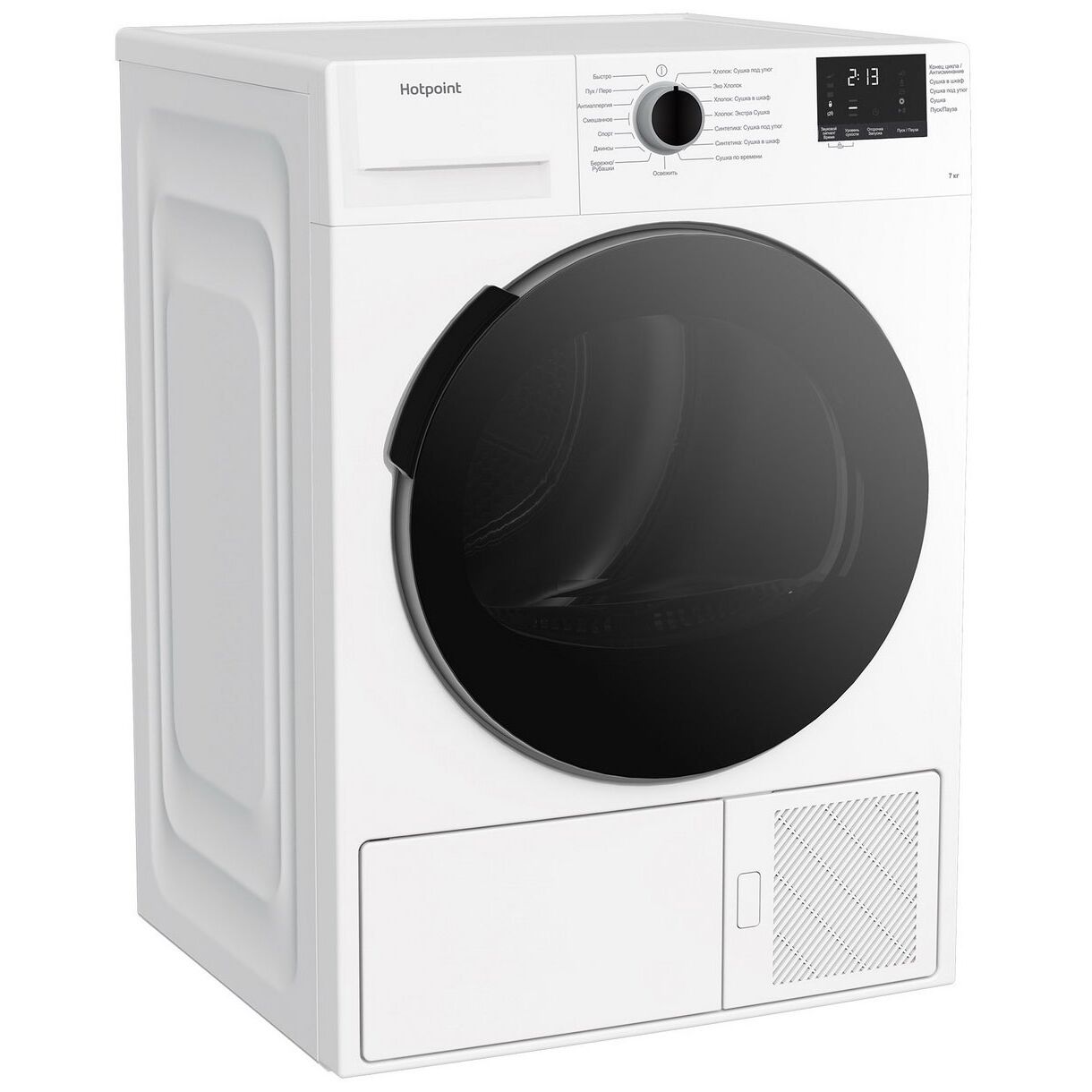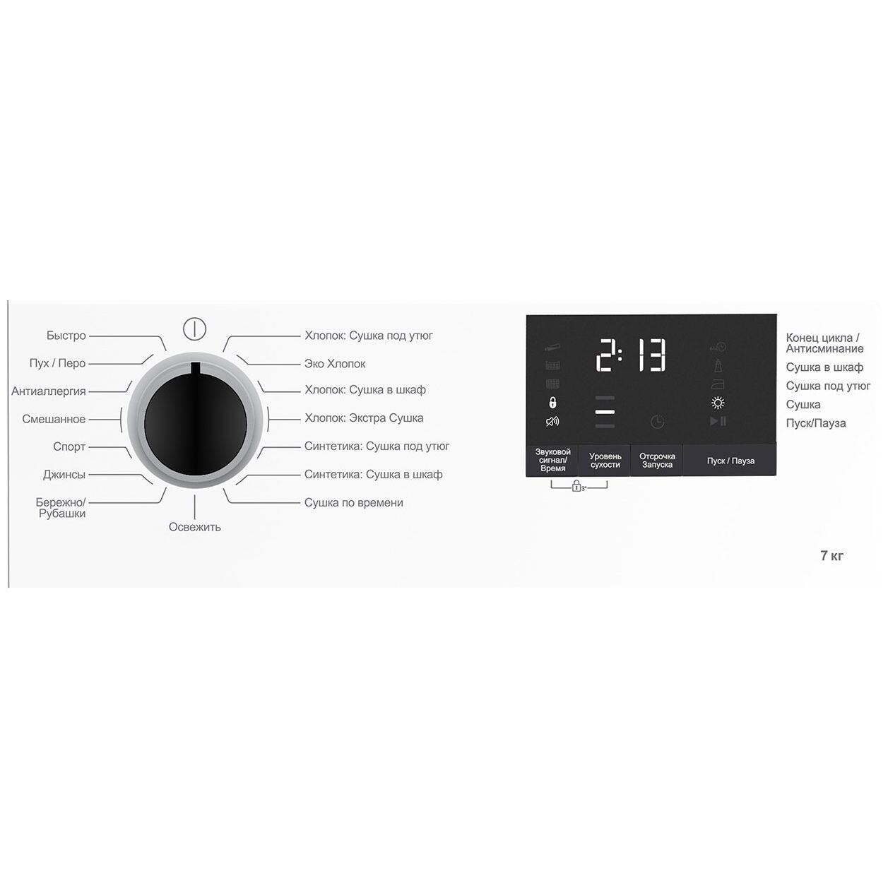 Общие данные: ; Габариты: 84.6x59.7x50.8 см; Максимальная загрузка: 7 кг; Класс энергопотребления: A-20%; Программы: ; Количество программ: 15, среди которых Быстро, Пух/Перо, Антиаллергия, Смешанное, Спорт, Джинсы, Бережно/Рубашки, Освежить, Хлопок: Сушка под утюг, Эко Хлопок, Хлопок: Сушка в шкаф, Хлопок: Экстра Сушка, Синтетика: Сушка под утюг, Синтетика: Сушка в шкаф, Сушка по времени; Дополнительные функции: ; Выбор уровня сухости; Функция: Время; Отсрочка запуска; Управление и индикация: ; Цифровой дисплей; Звуковой сигнал; Дополнительная информация: ; Премиальный люк черного цвета; Тип мотора: Коллектор; Тип : Heat pump (Сушка с тепловым насосом)