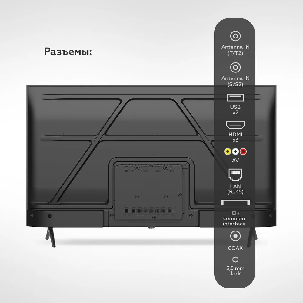 Интерфейсы и разъемы: Беспроводные интерфейсы: Wi-Fi, Bluetooth: Число портов HDMI: 3: Интерфейсы: HDMI, USB, RJ-45 (Ethernet), Композитный, 3.5 мм, CI+: Количество разъемов USB: 2: Габариты и вес: Стандарт крепления VESA: 100x100 мм: Размеры, мм: 892 x 560 x 246: Ширина, см: 89: Высота, см: 51.2: Размер без подставки (ШxВxГ), мм: 892 х 504 х 72: Вес товара, г: 4700: Память: Оперативная память: 1 ГБ: Объем встроенной памяти: 8 ГБ: Экран: Диагональ экрана, дюймы: 40: Разрешение: 1920x1080 Full HD: Тип подсветки: Direct LED: Частота обновления: 60 Гц: Диагональ экрана, см: 101.6: Изогнутый экран: Нет: Стандарт разрешения: Full HD: Технология HDR: Нет: Функции: Smart TV: Да: Операционная система ТВ: Салют ТВ: ТВ-тюнер: DVB-C, DVB-T, DVB-T2, DVB-S2: Встроенный медиаплеер: Да: Управление телевизором: Пульт ДУ: Звук: Мощность аудиосистемы, Вт: 16: Сабвуфер: Нет: Цвет: Черный, черный матовый: Интерьерный телевизор: Нет: Мощность, Вт: 65: Страна-изготовитель: Китай;;