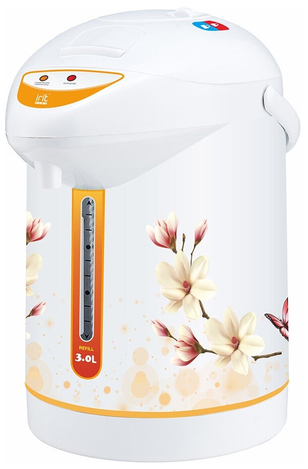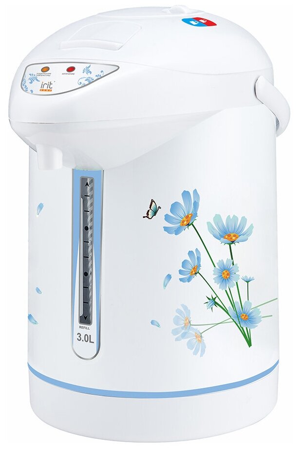 тип: термопот, материал корпуса: металл, объем: 3 л, тип нагревательного элемента: закрытая спираль, дополнительные функции: поддержание тепла, особенности: рисунок на корпусе, двойные стенки, индикатор уровня воды, индикация включения, съемная крышка